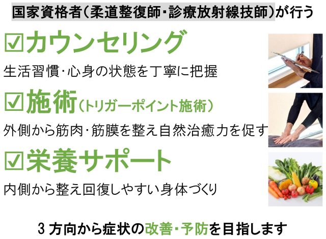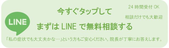 | 予約 | 当院は予約優先制の整体院です。電話やLINEでご予約の上、ご来院ください。空きがある場合は、当日予約も可能です。ご予約なしの場合は、お待ちいただく場合や当日対応できない場合もあります。 ※キャンセルは前日までにご連絡ください。 |
