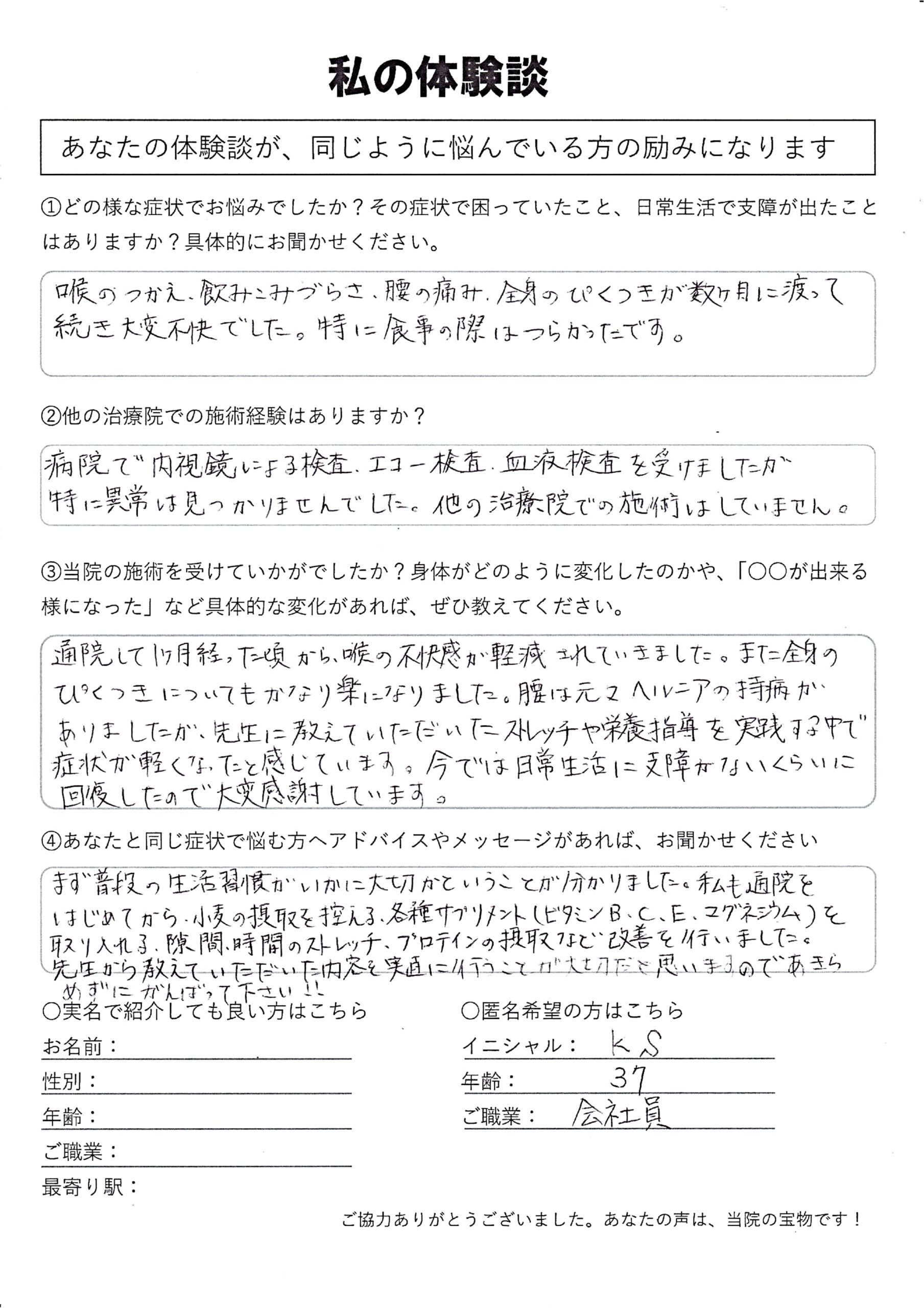| ヒステリー球・喉のつかえ・飲みこみづらさ・全身ぴくつき・ヘルニア・腰痛 K.S様 30代 男性 |