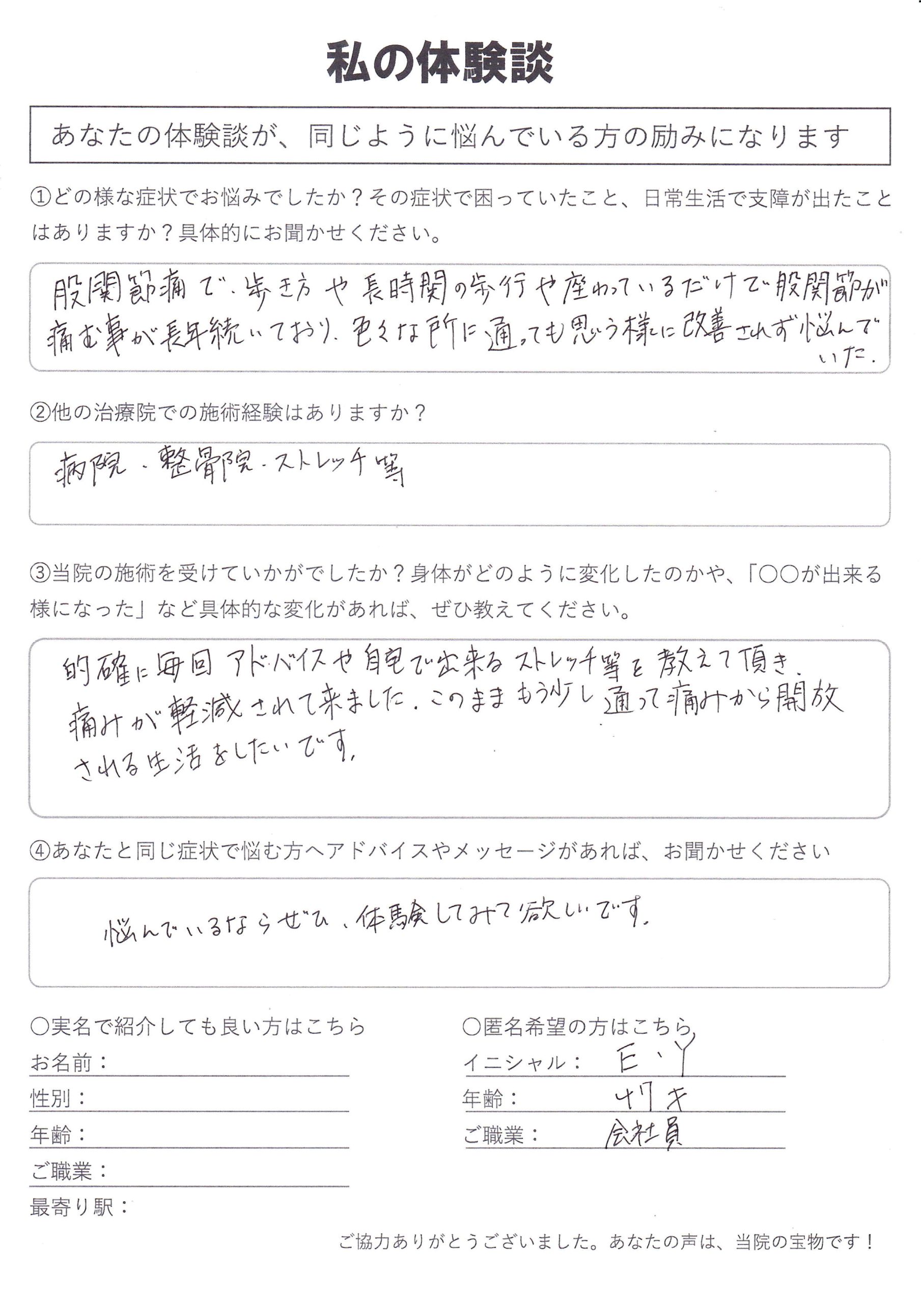 股関節痛で、歩き方や長時間の歩行や座っているだけで、股関節が痛むことが長年続いており、色々な所に通っても思う様に改善されず悩んでいた。