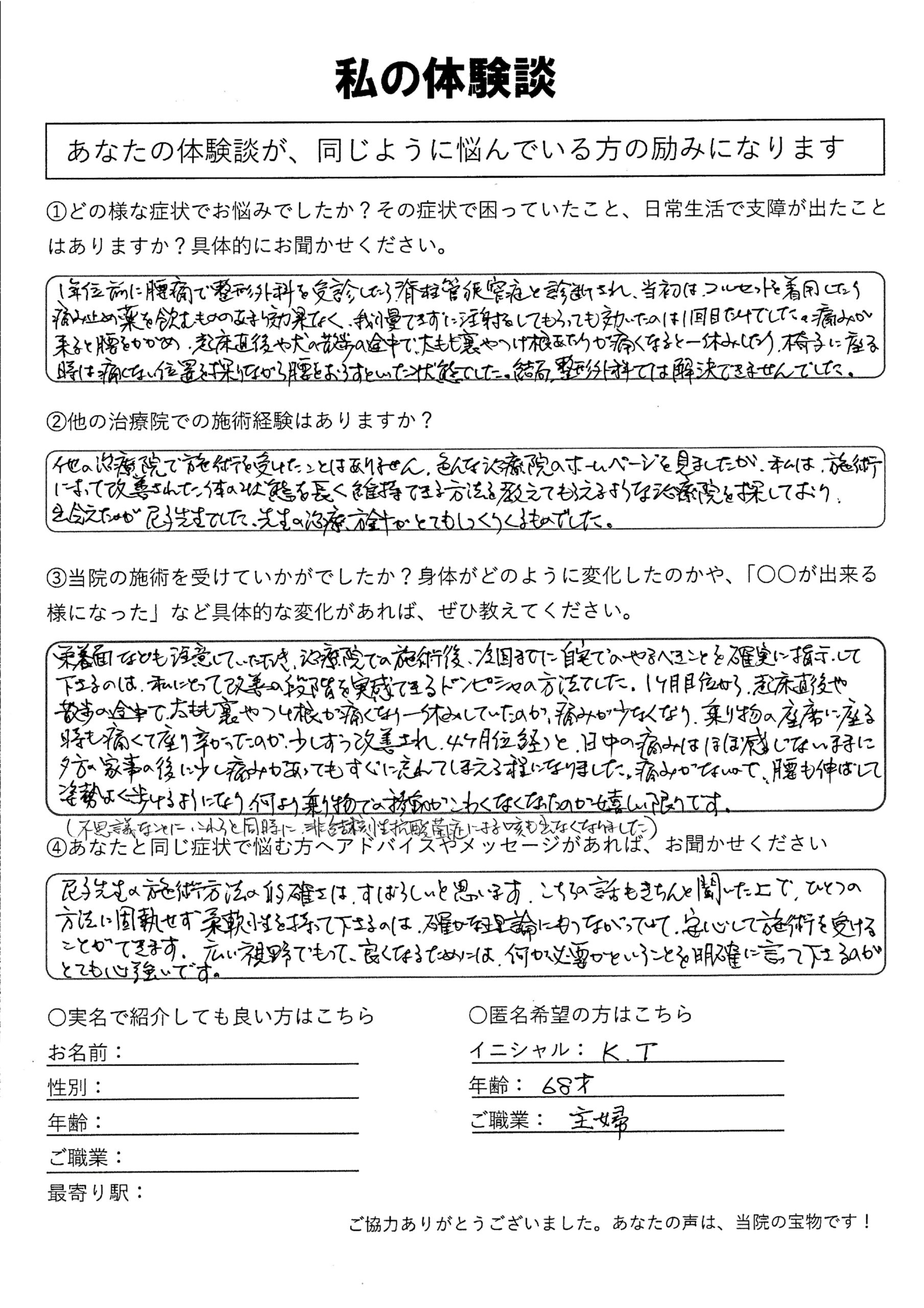 | 脊柱管狭窄症・腰椎すべり症・非結核性抗酸菌症 K.T様 60代 女性 |