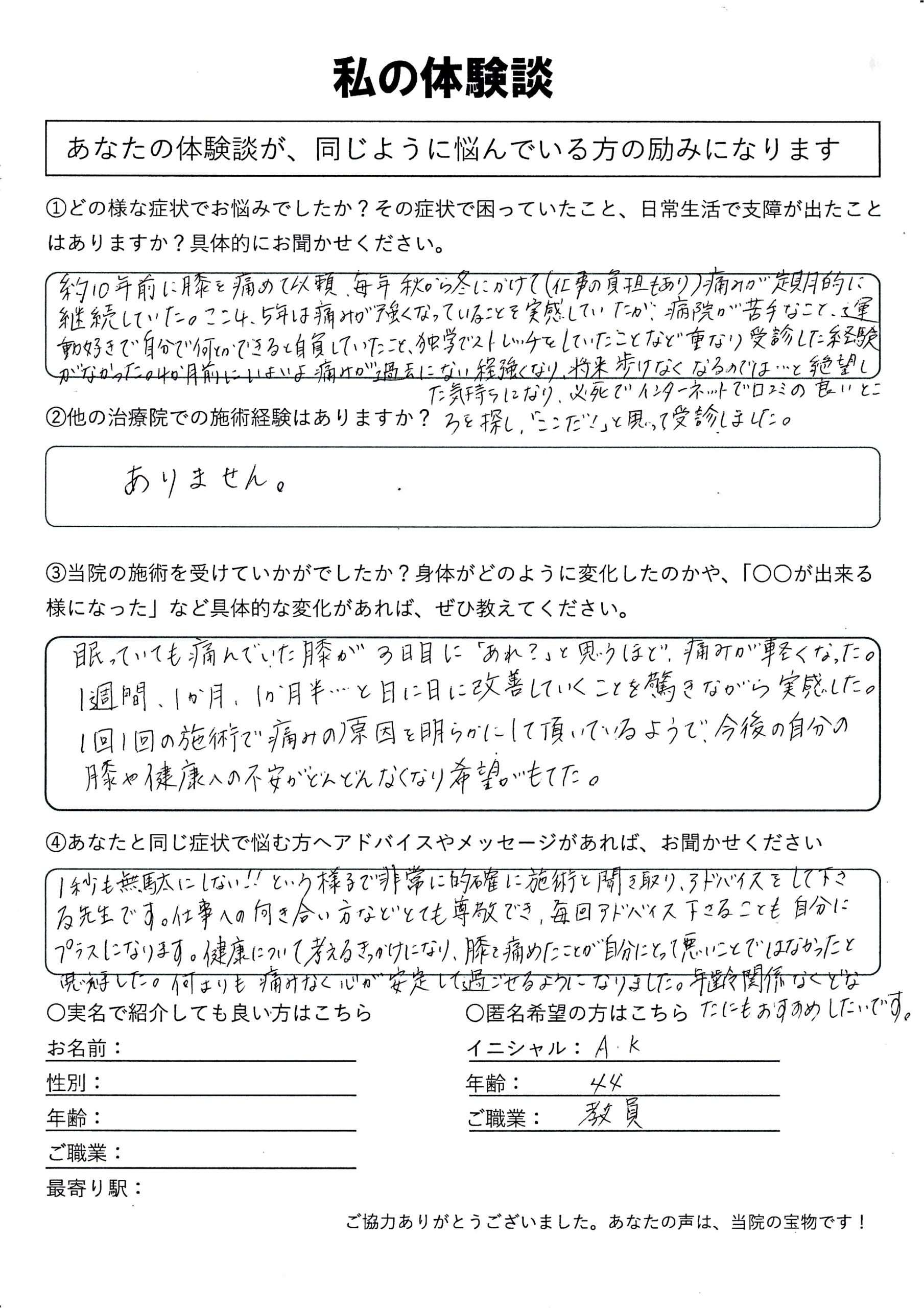 | 膝痛・変形性膝関節症 A.K様 40代 女性 教員 |