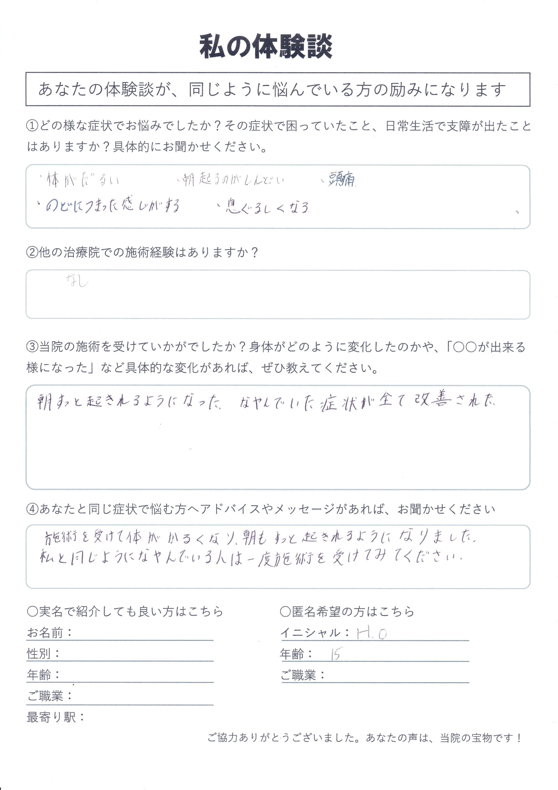 | 起立性調節障害・朝起きられない・頭痛 H.O様 15歳 中学生 |