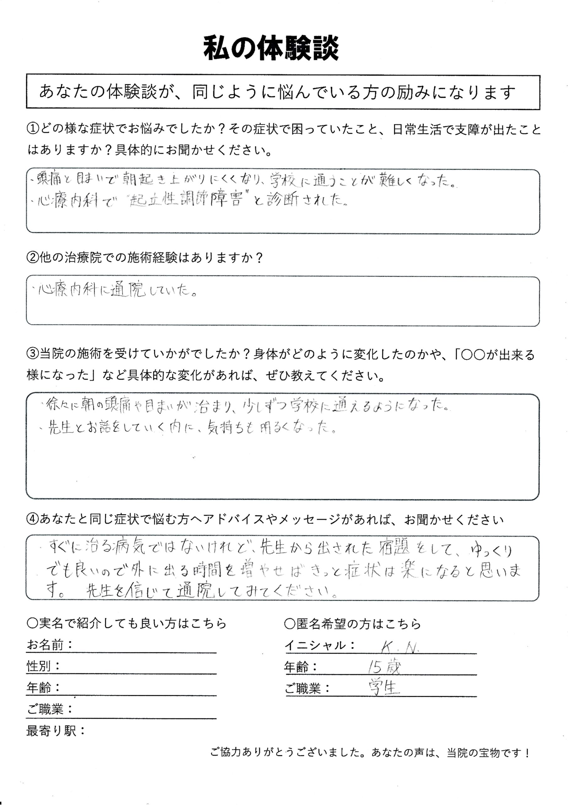 | 起立性調節障害・頭痛・めまい・腹痛 K.N様 15歳 学生 |