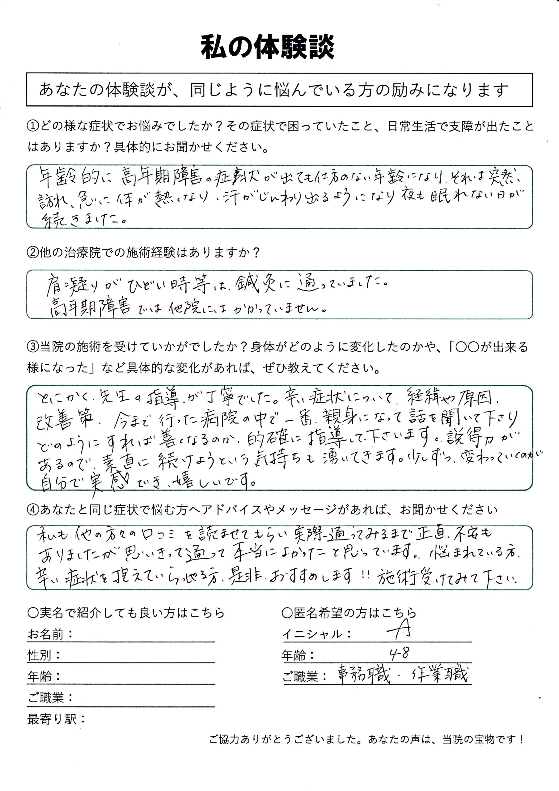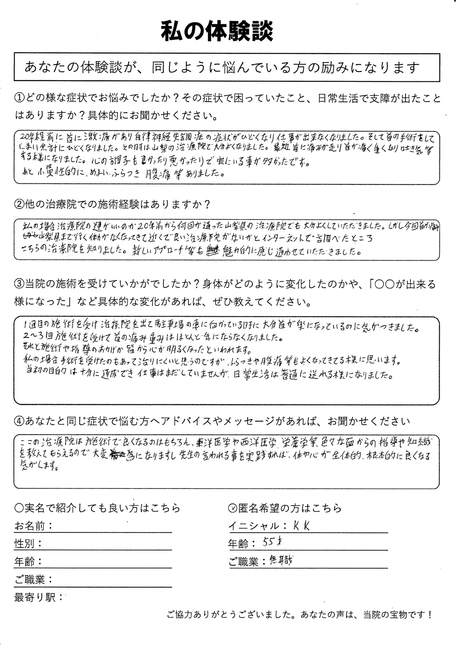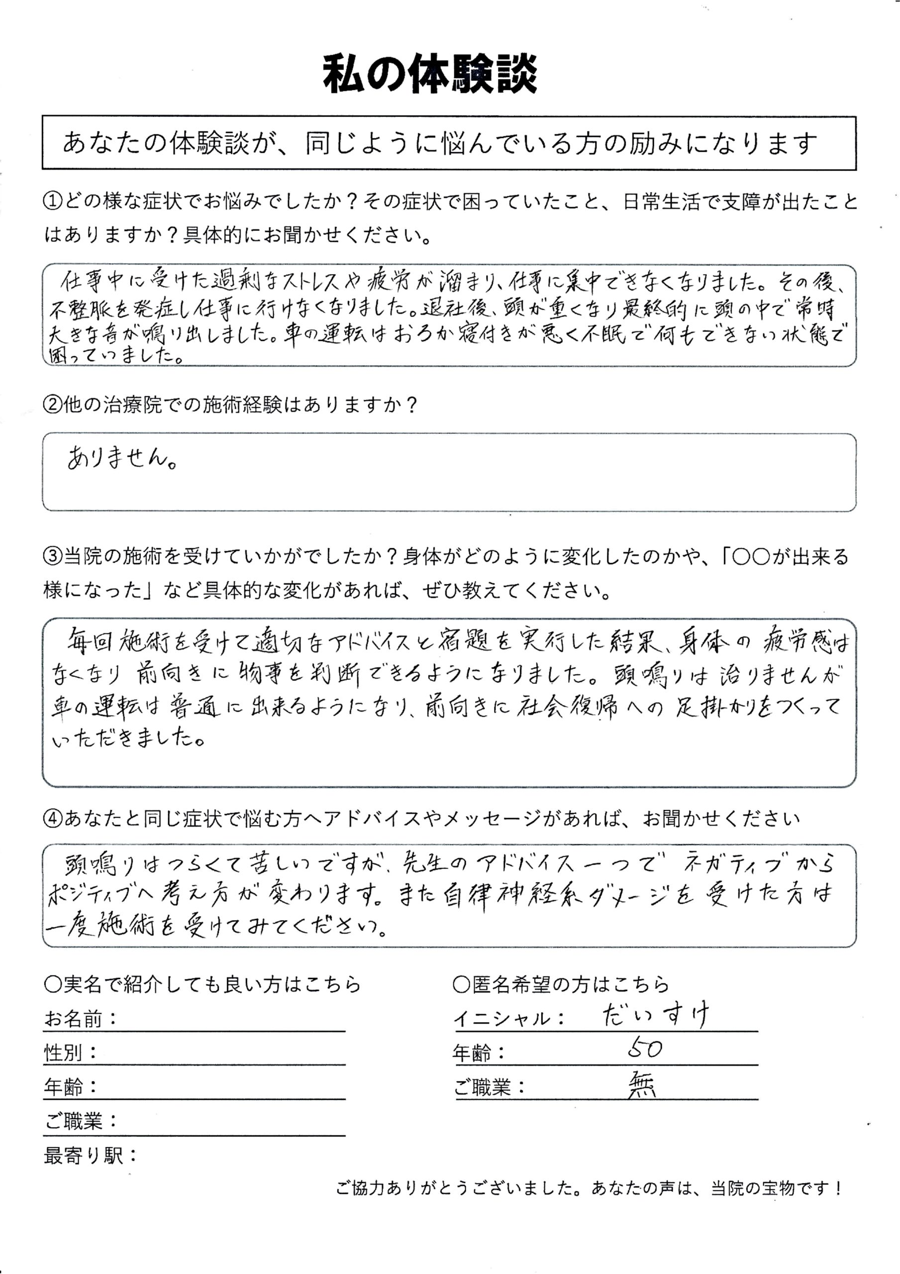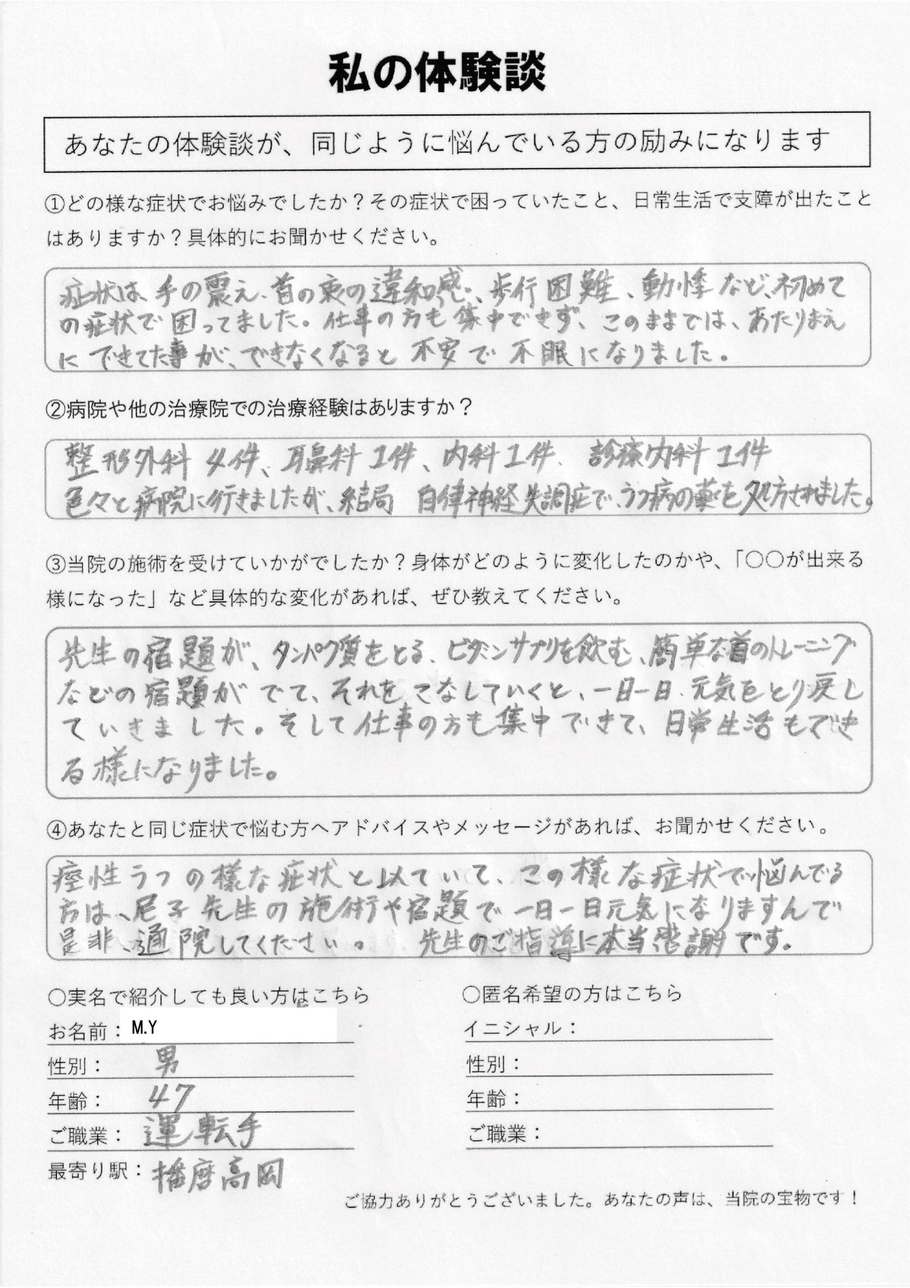 | 自律神経失調症・うつ病・頚性うつ・首こり病(頚性神経筋症候群) M.Y様 40代 男性 |