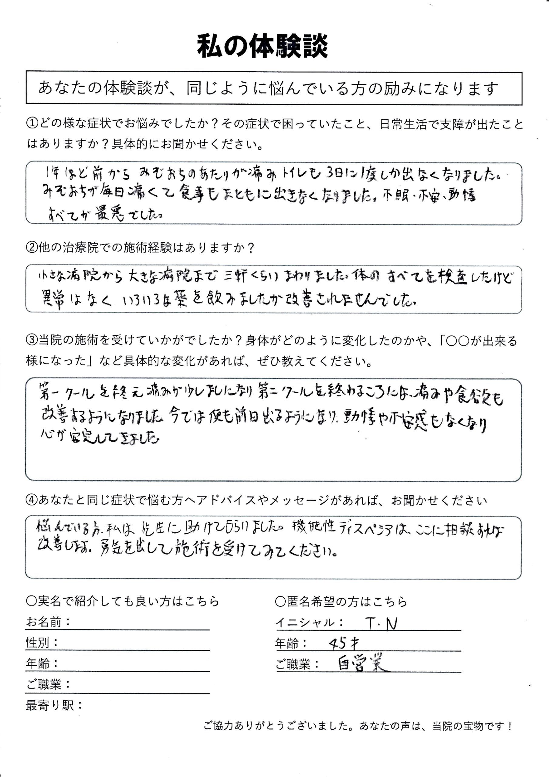| 毎朝の便秘に悩んでいましたが、施術後はびっくりするほどスッキリして楽になりました。