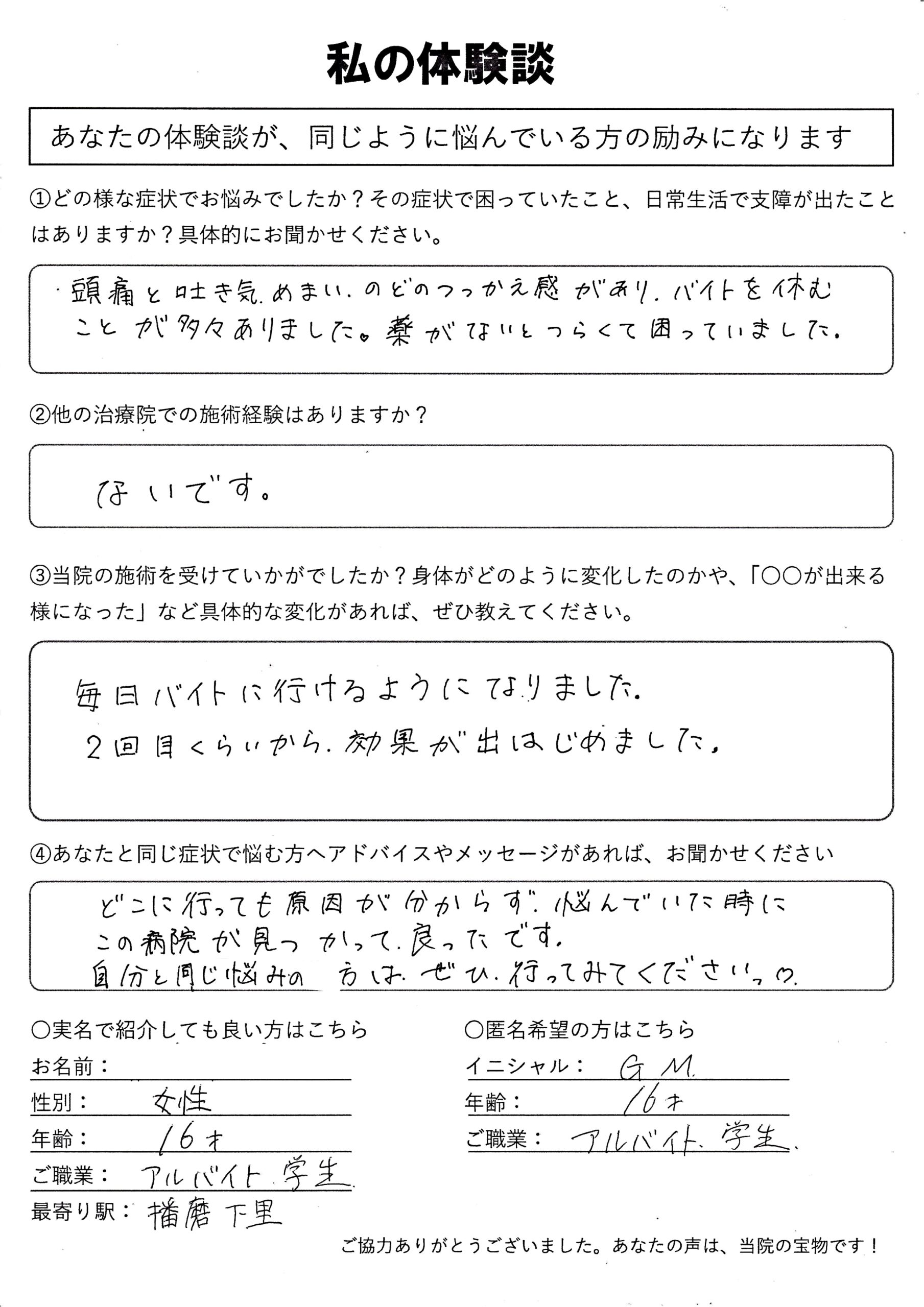 | 起立性調節障害・頭痛・ふらつき・吐き気・不眠 N.M様 10代 女性 |