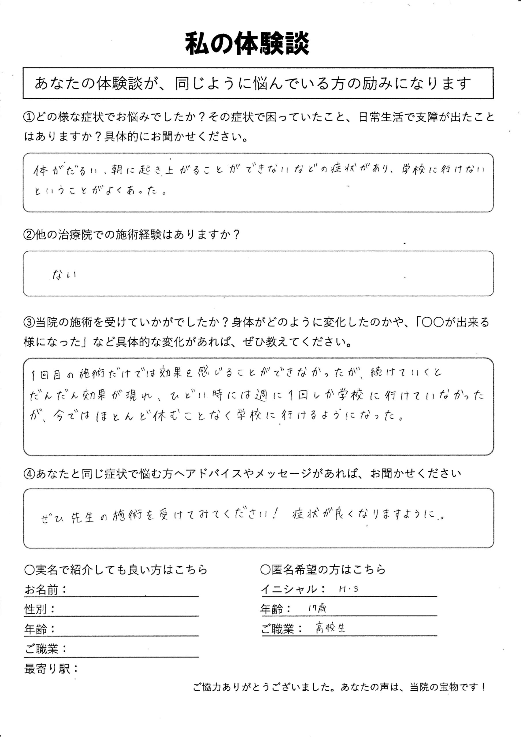 | 起立性調節障害・朝起きられない・体がだるい H.S様 10代 女性 |
