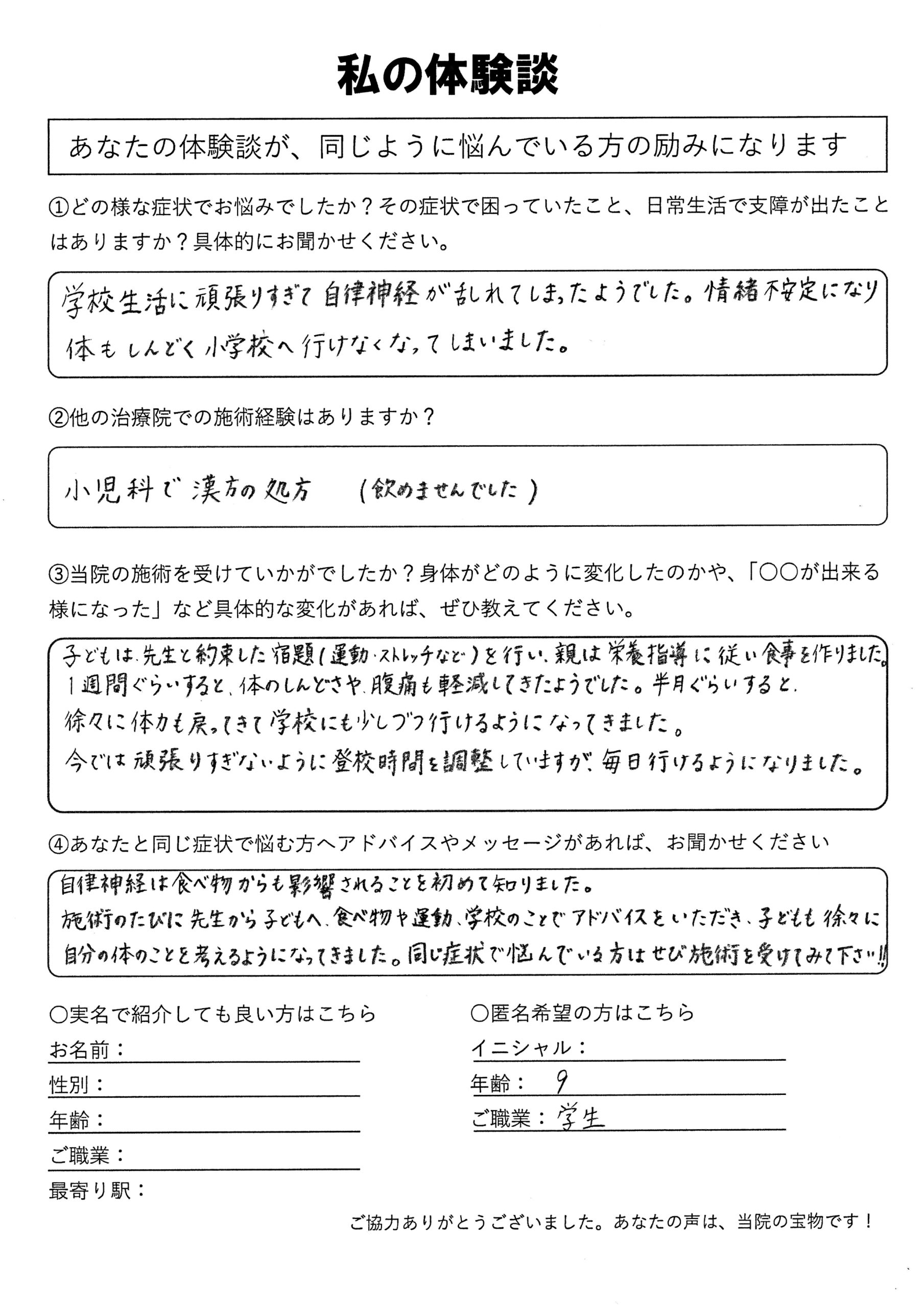 | 腹痛で学校に通えず他の治療院でも改善しませんでしたが、施術を受けてから通学できるようになりました。