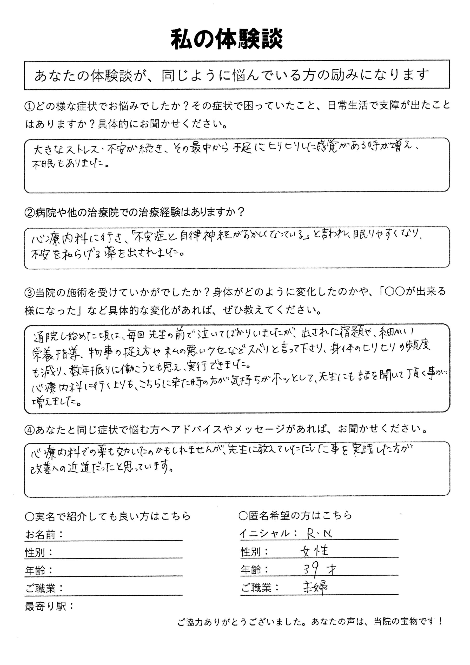 | 自律神経失調症・不安障害・不眠 R.N様 30代 女性 |
