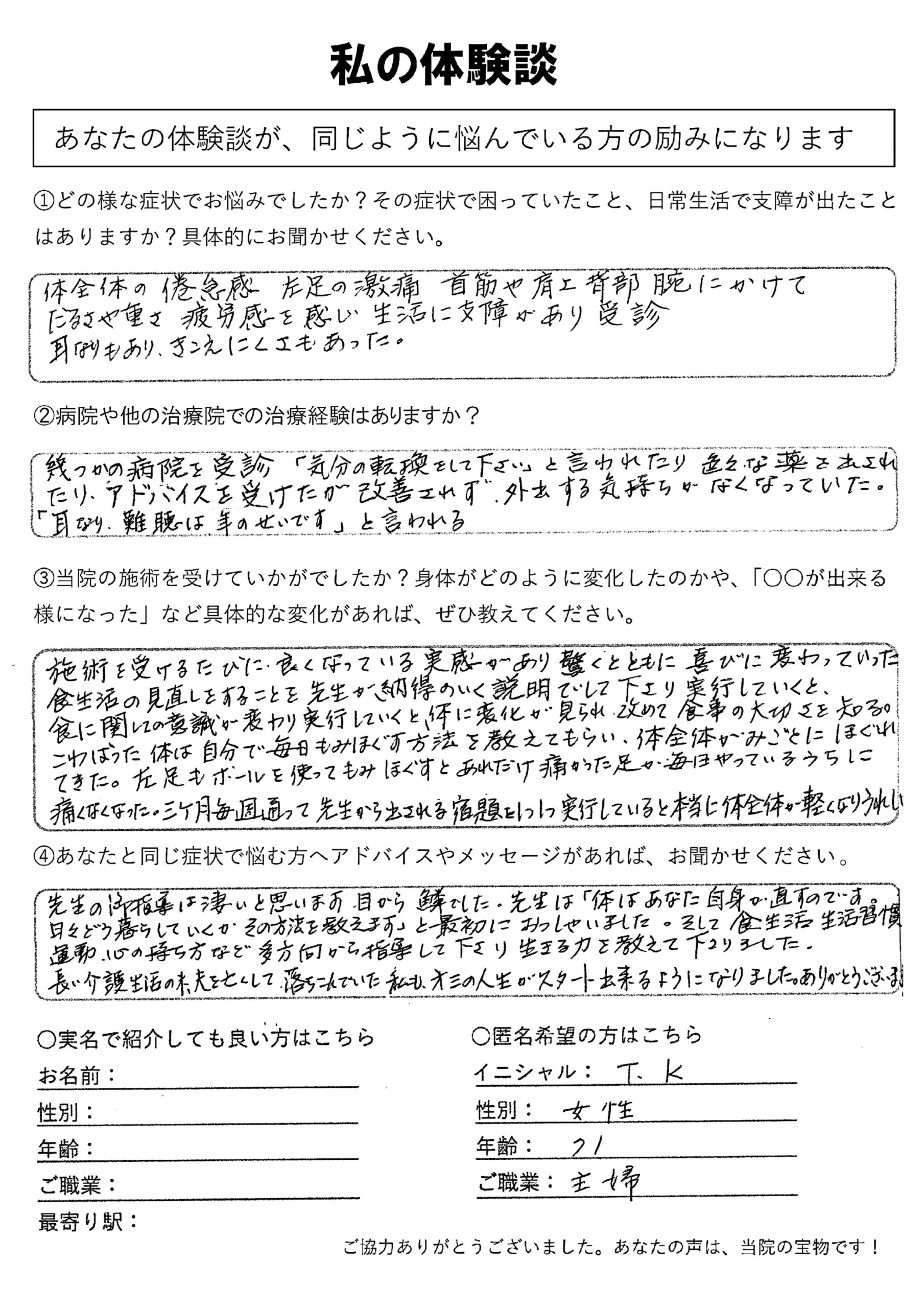 | うつ病・自律神経失調症・倦怠感・疲労感・耳鳴り・難聴・首肩こり・腰痛・坐骨神経痛 T.K様 70代 女性 |