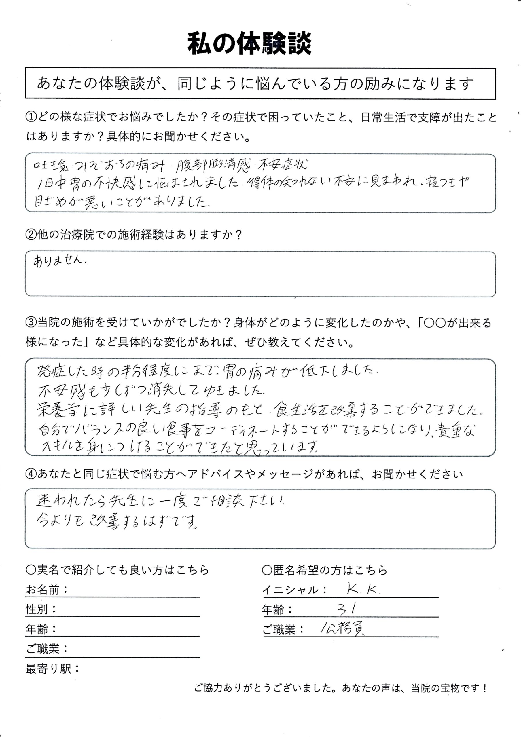 | 機能性ディスペプシア・吐き気・みぞおち痛・腹部膨満感・不安・胃の不快感 K.K様 30代 男性 |
