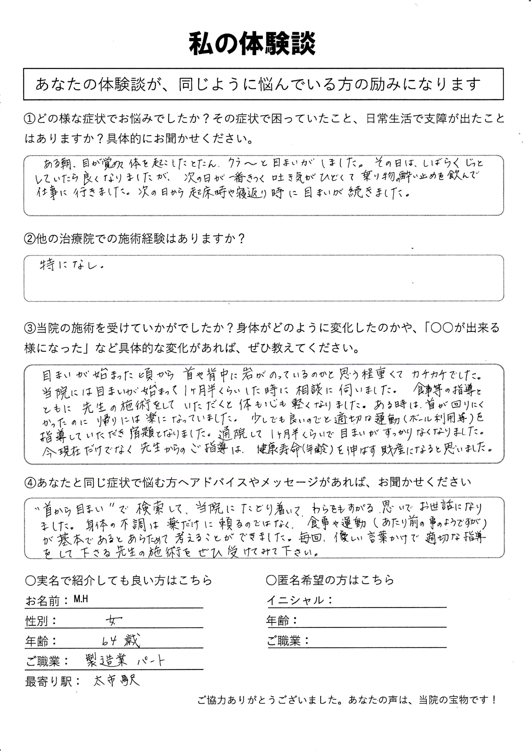 | めまい・吐き気 M.H様 60代 女性 |