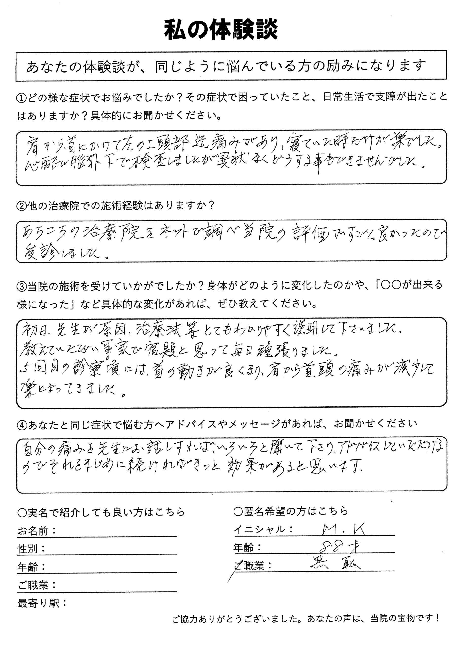 | 頭痛・首痛・首こり病 M.K様 88歳 女性 |