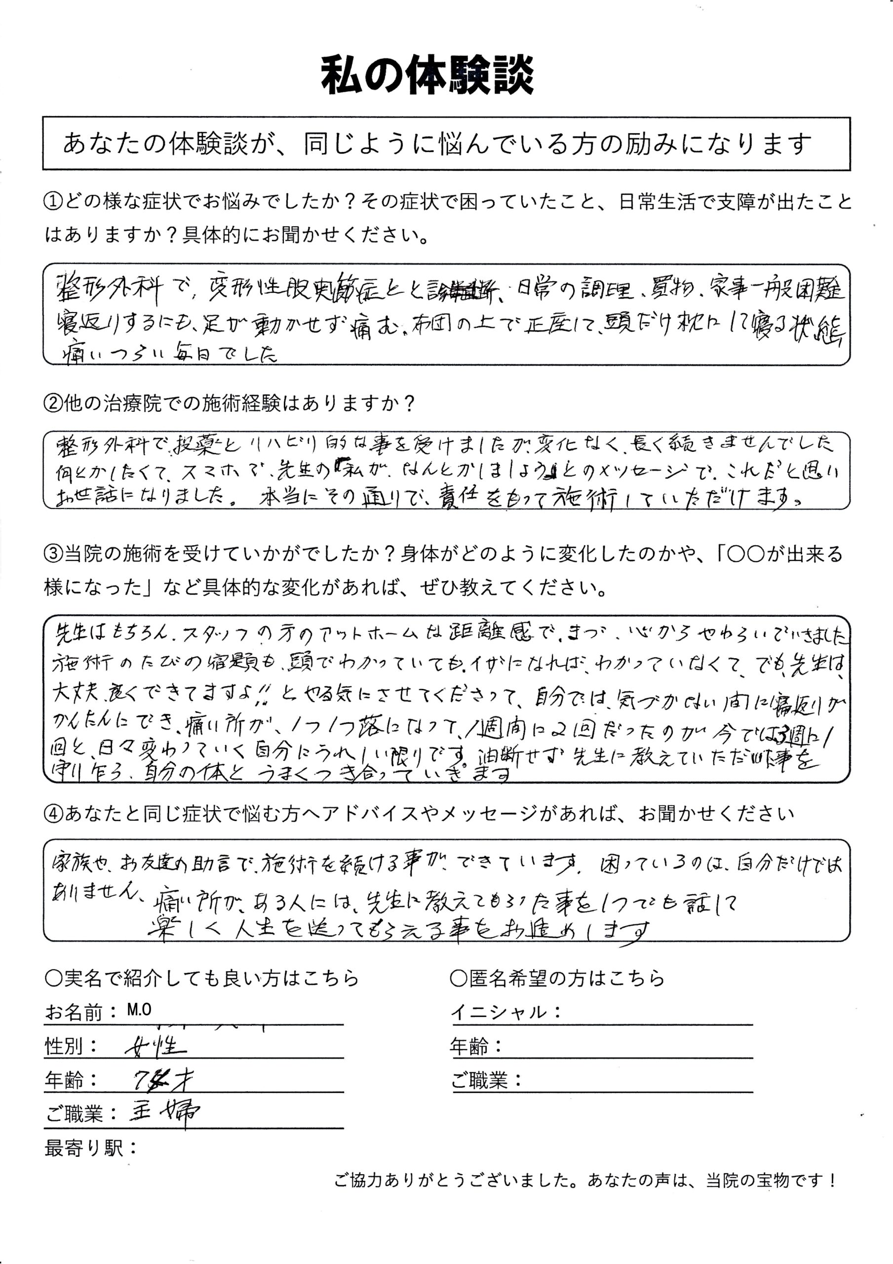 | 脊柱管狭窄症・変形性股関節症 M.O様 70代 女性 |