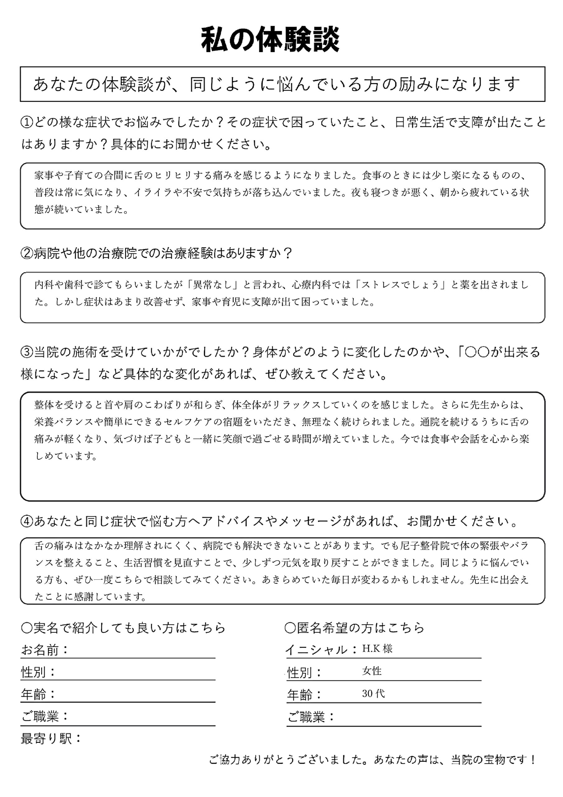 | 舌痛症・うつ病 H.K様 30代 女性 |
