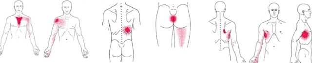 特定の筋肉に生じたトリガーポイントが、離れた場所に症状が出るパターン(赤い部分)を示しています。