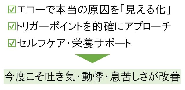 もしあなたがこのような吐き気・動悸・息苦しさでお悩みであれば、当院にお任せください。