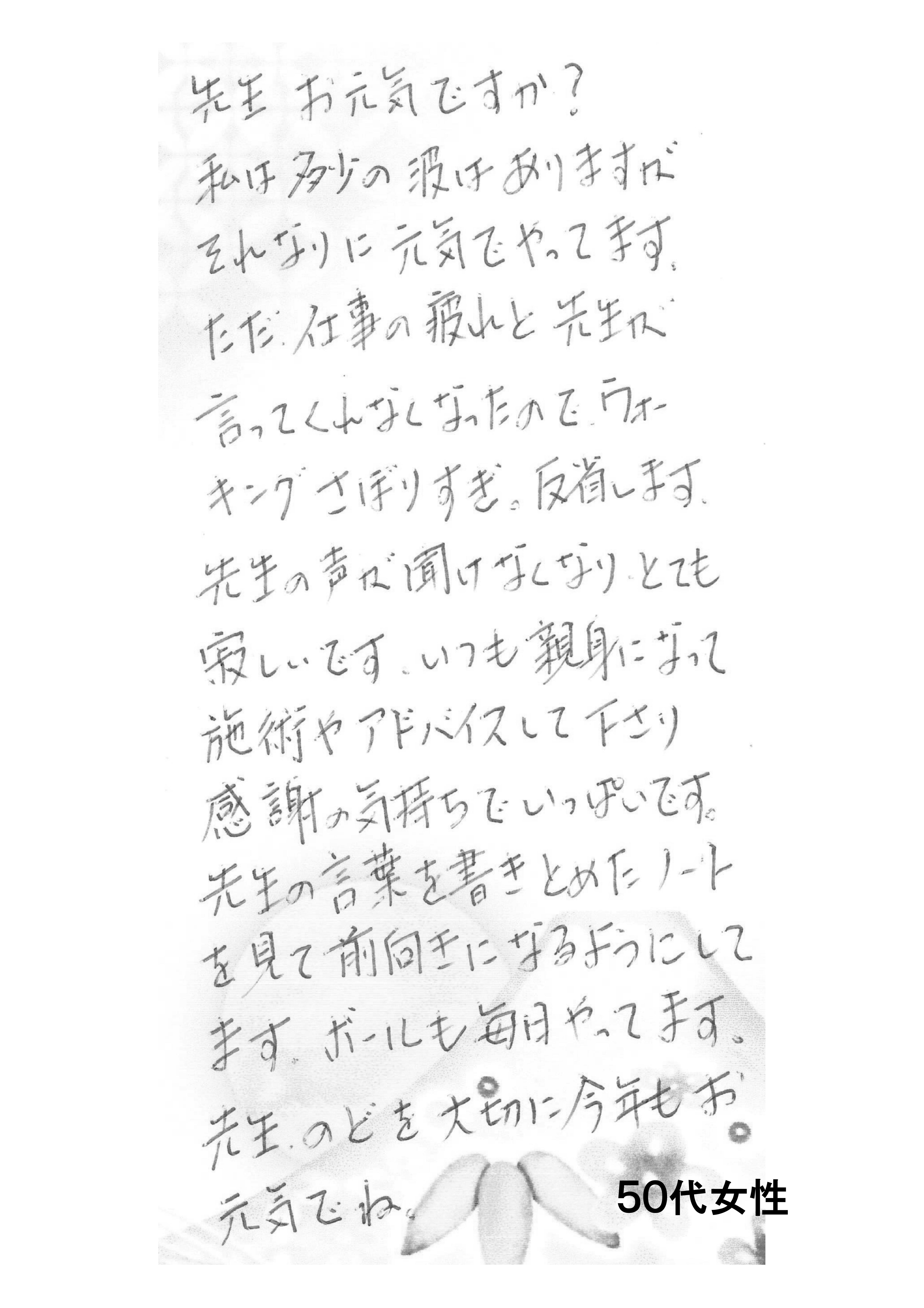 いつも親身になって施術やアドバイスしてくださり感謝の気持ちでいっぱいです。 ※画像をクリック(タップ)すると拡大します |