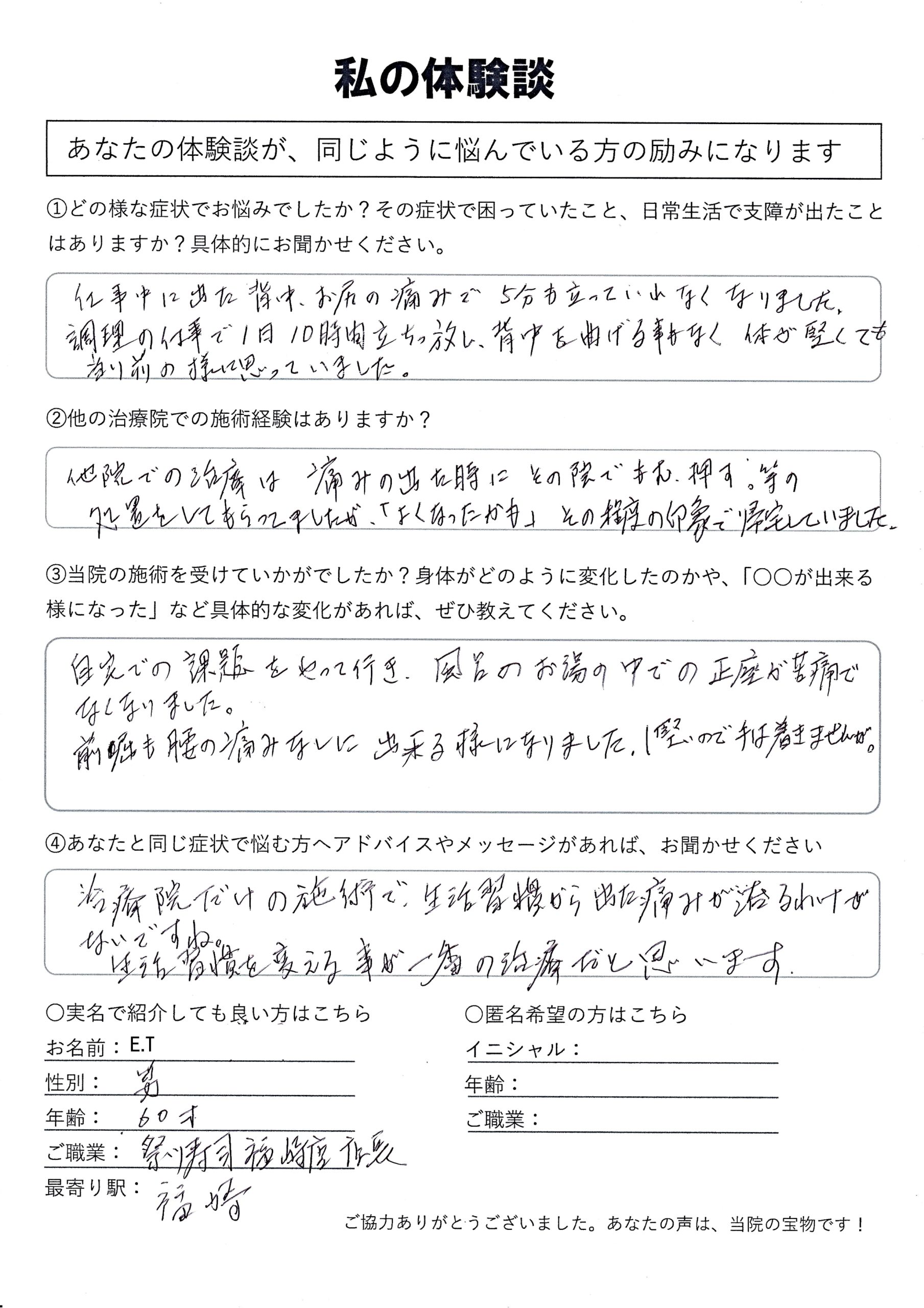 | 脊柱管狭窄症・坐骨神経痛 E.T様 60代 男性 |