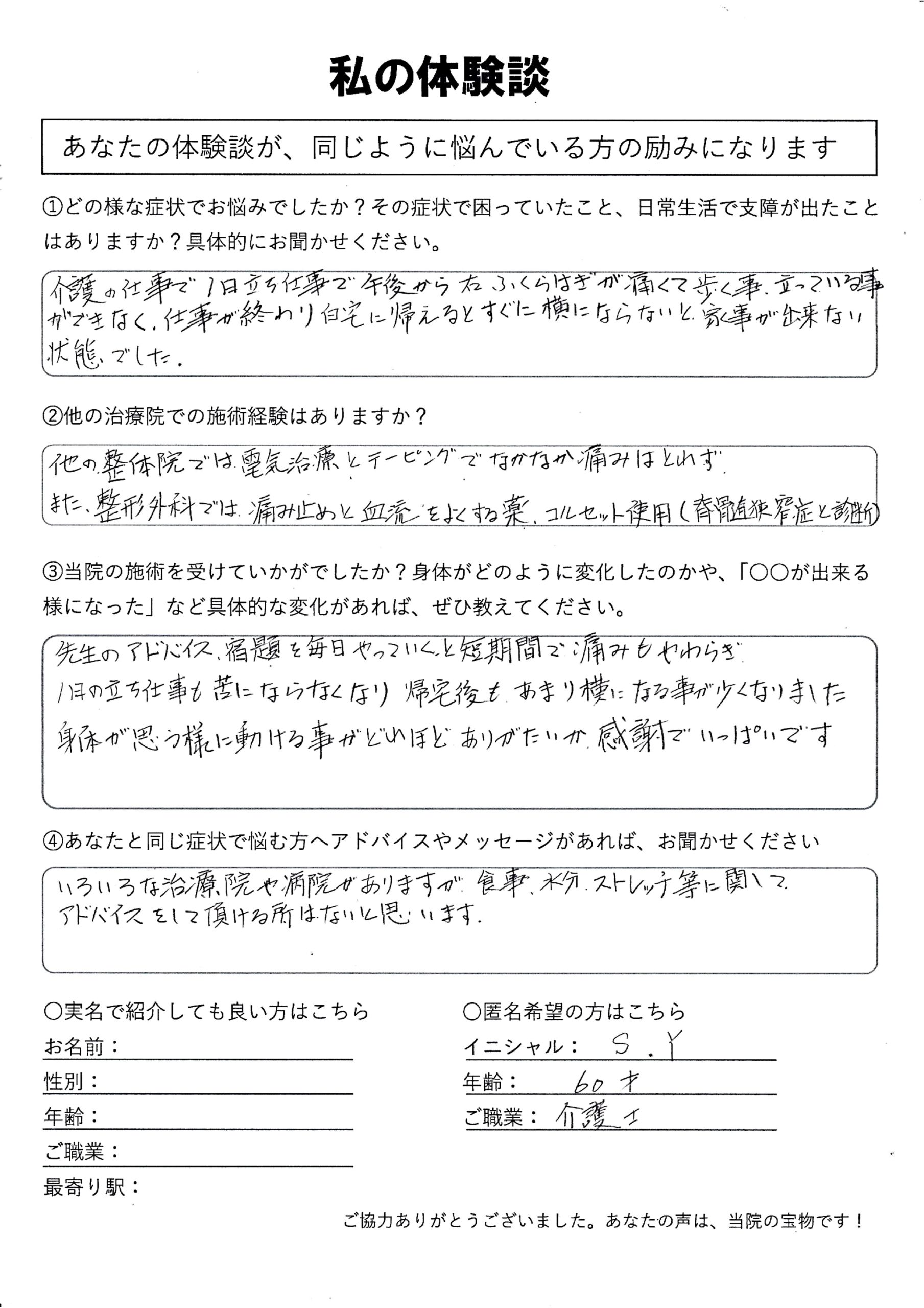 | 脊柱管狭窄症・坐骨神経痛 S.Y様 60代 女性 |