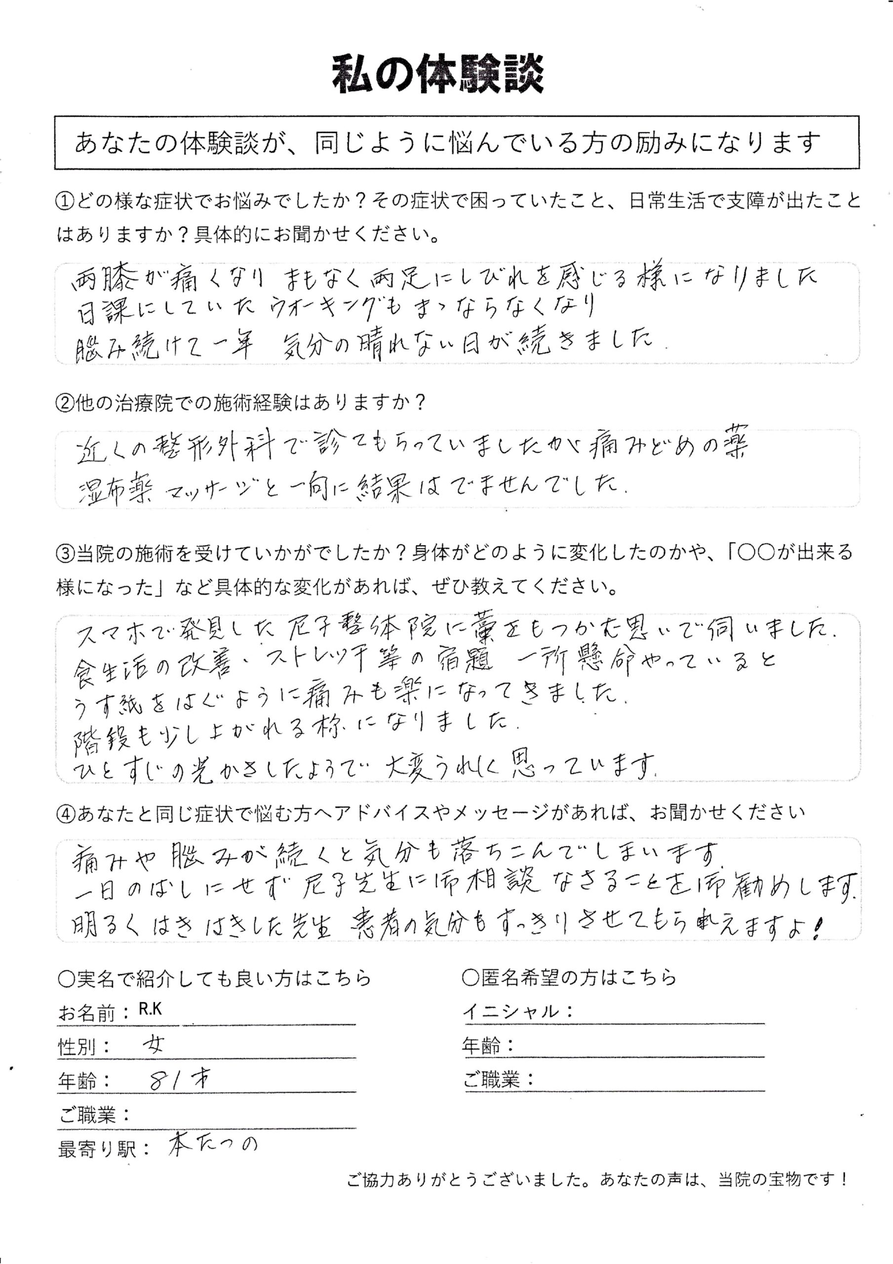 | 脊柱管狭窄症・変形性膝関節症 R.K様 80代 女性 |