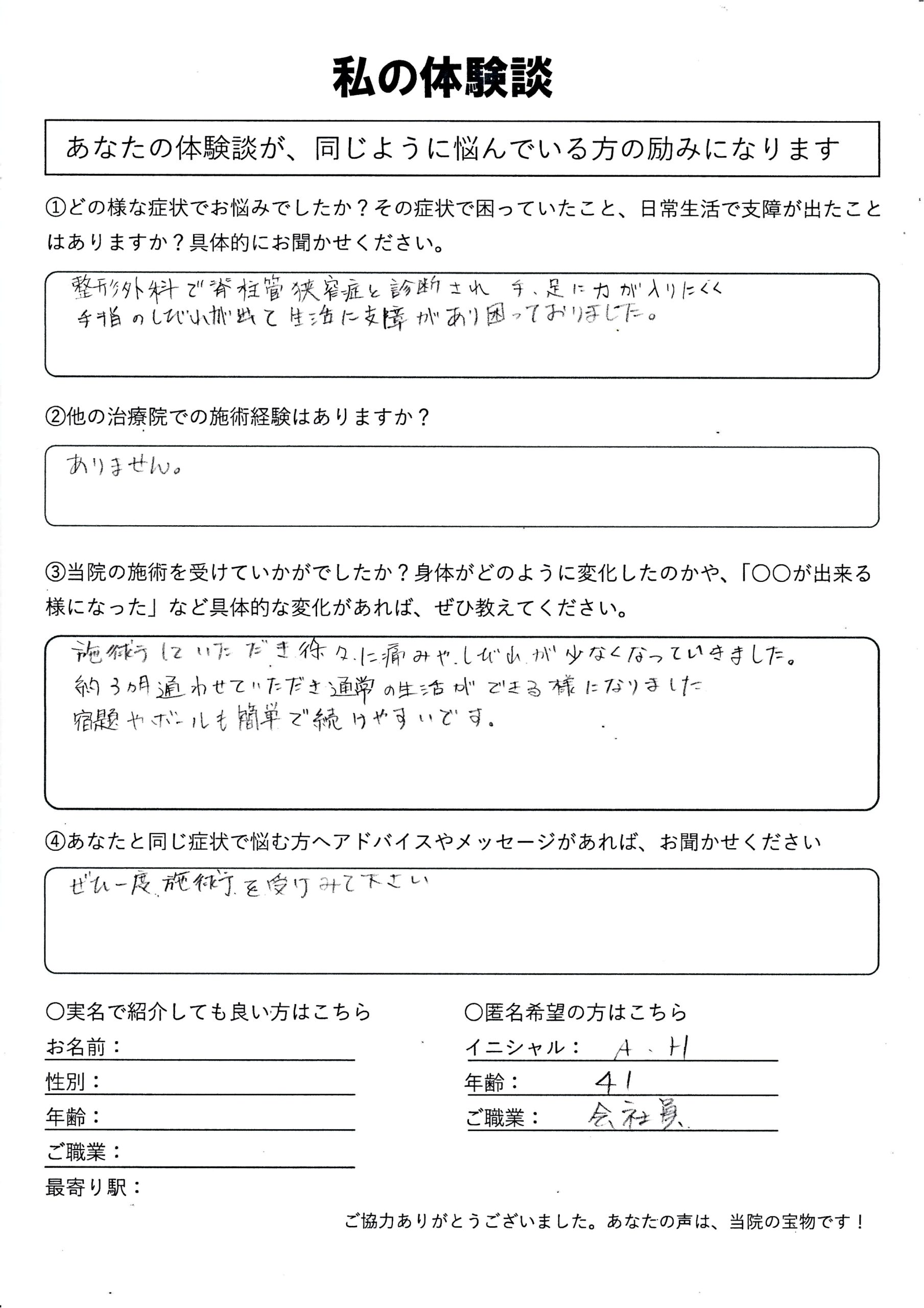 | 手術を提案された頚部脊柱管狭窄症・痛み・しびれ・力が入りにくい A.H様 40代 男性 |