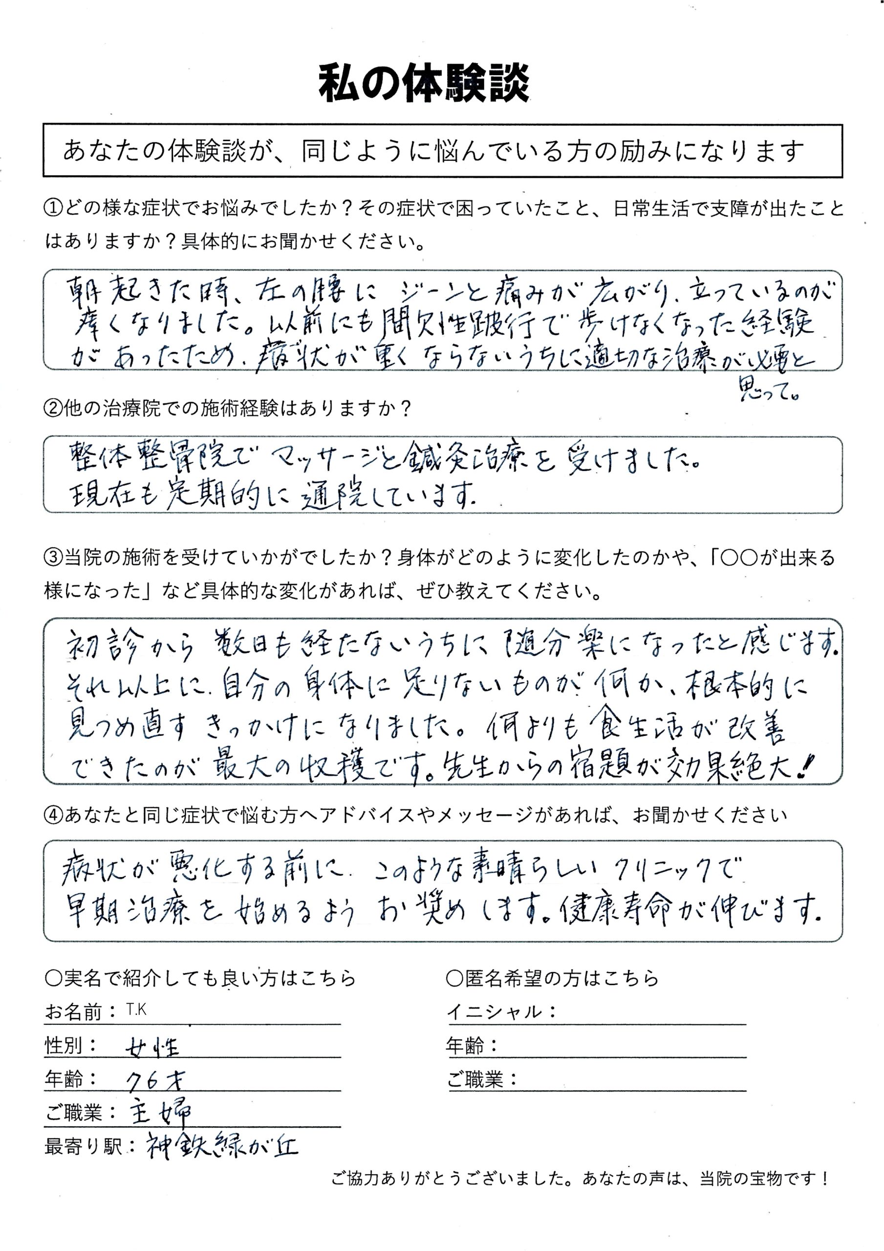 | 脊柱管狭窄症・坐骨神経痛・変形性膝関節症・膝痛・歩行困難 T.K様 60代 女性 |