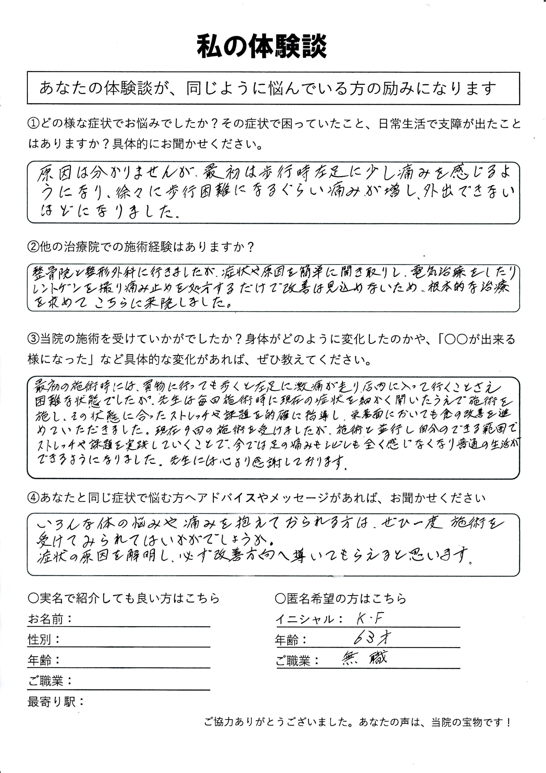 | 脊柱管狭窄症・坐骨神経痛・歩行困難 K.F様 60代 男性 |