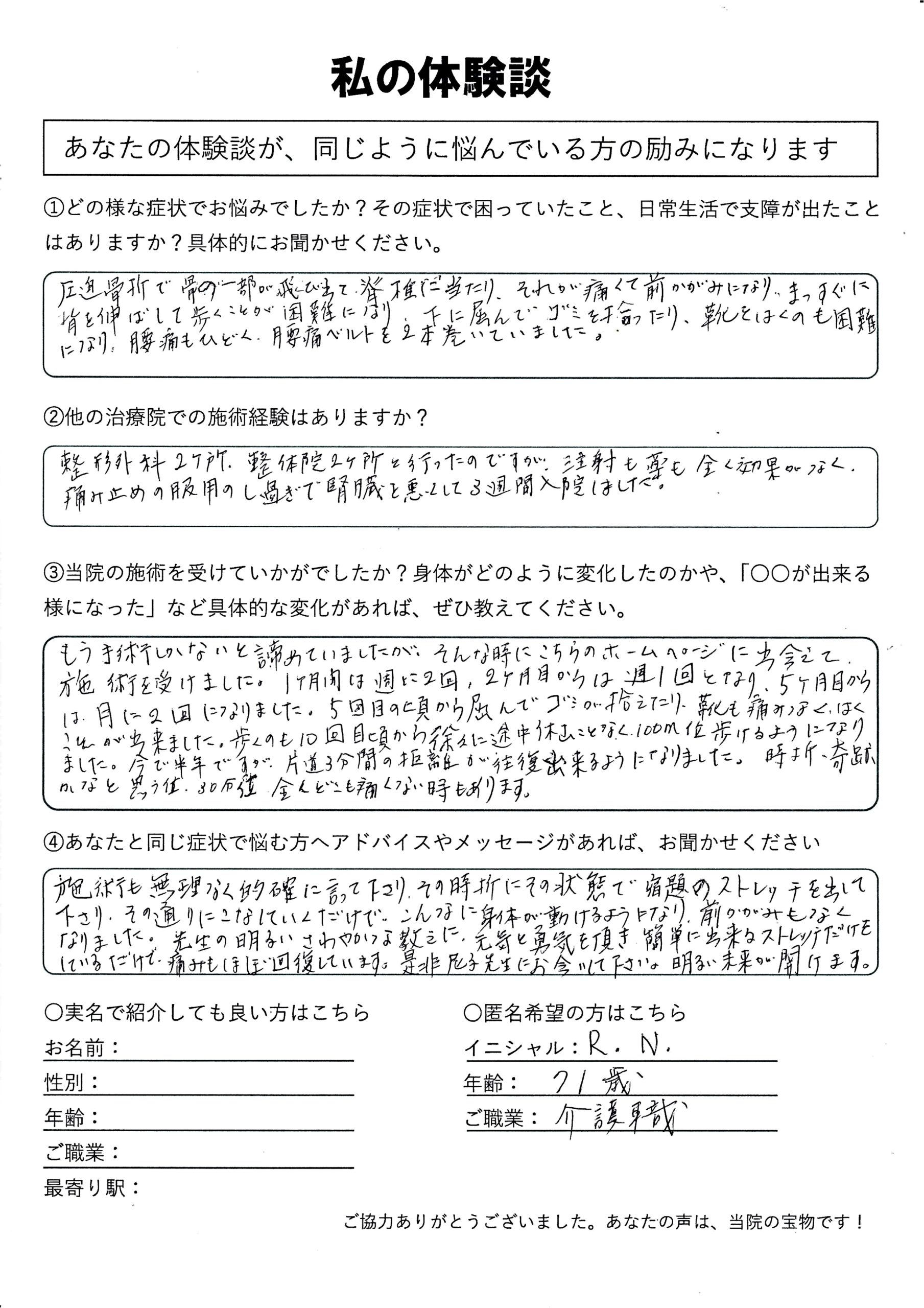 | 圧迫骨折・脊柱管狭窄症・坐骨神経痛 R.N様 70代 女性 |