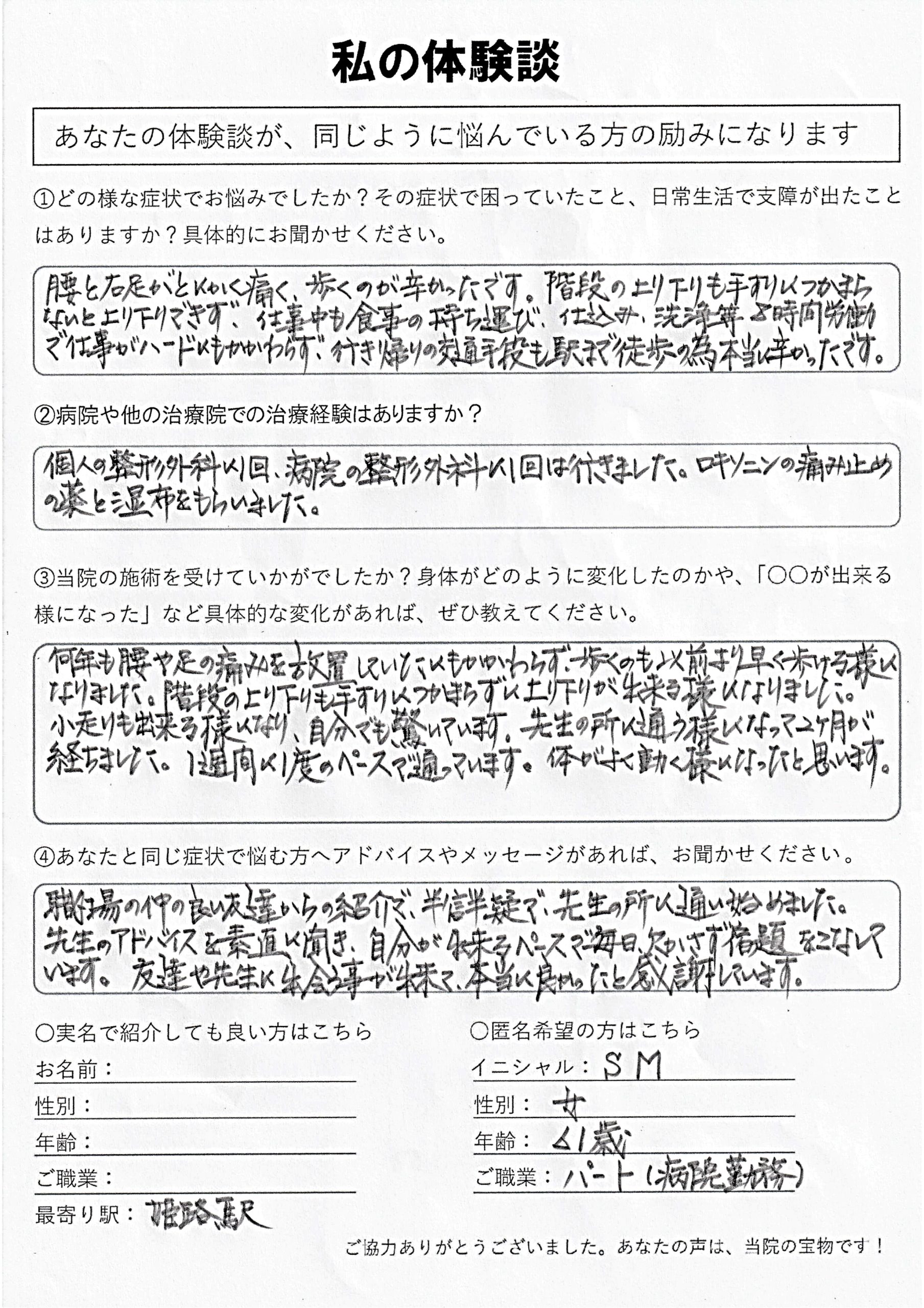 | 脊柱管狭窄症・坐骨神経痛 S.M様 60代 女性 |