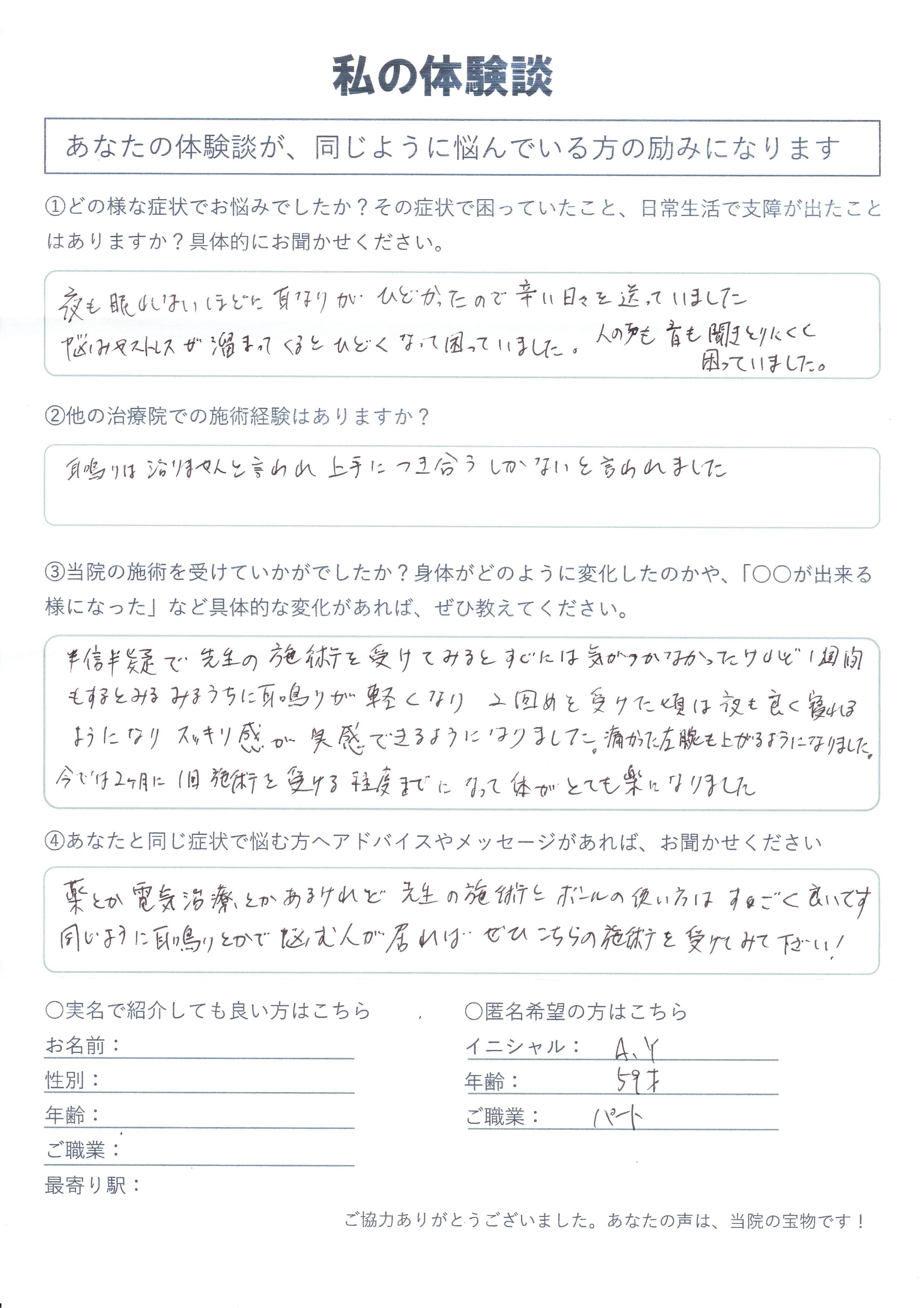 | 耳鳴り・耳閉感・難聴・夜眠れない A.Y様 59歳 女性 |