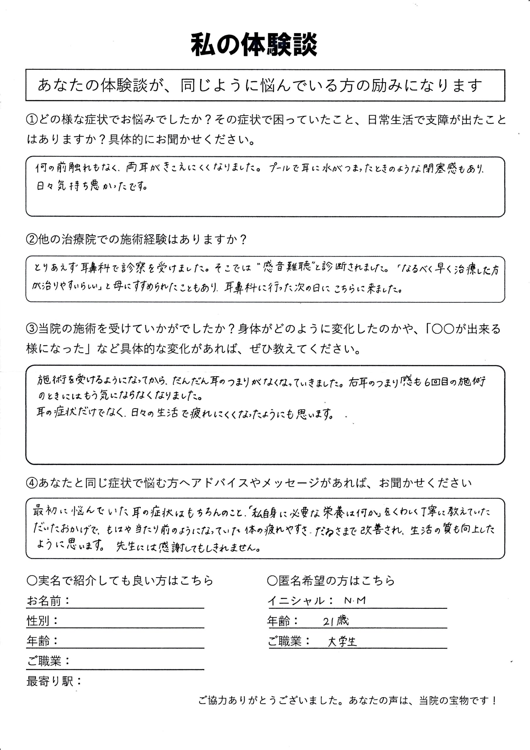 | 感音性難聴・突発性難聴・耳鳴り・耳閉感 N.M様 20代 女性 |