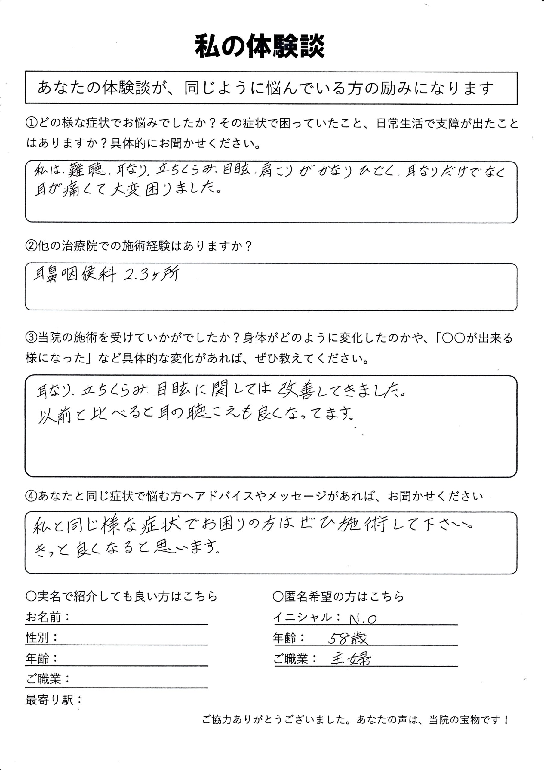 | 難聴・耳鳴り・耳痛・めまい・立ちくらみ N.O様 50代 女性 |