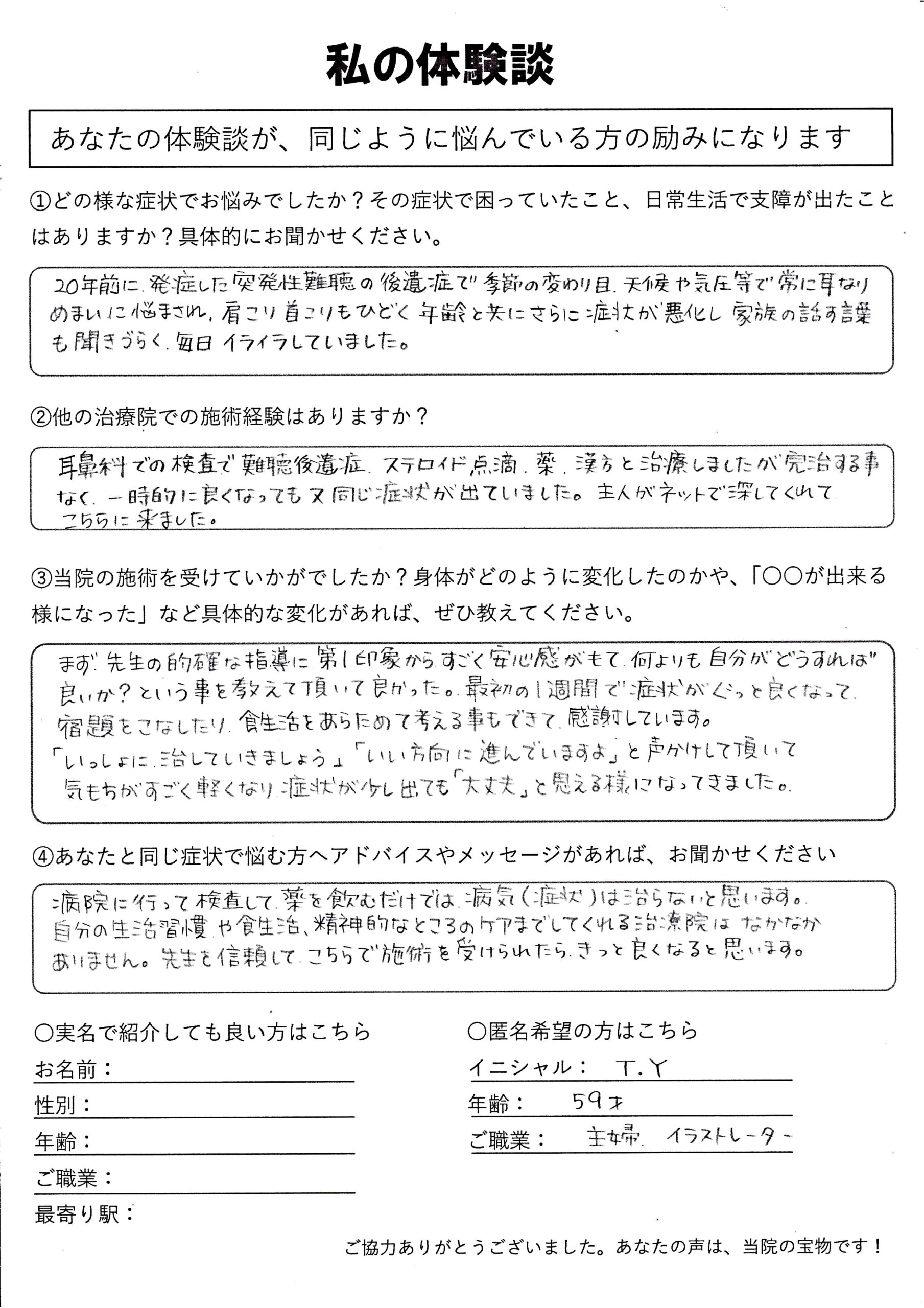 | 突発性難聴・耳鳴り・めまい T.Y様 50代 女性 |