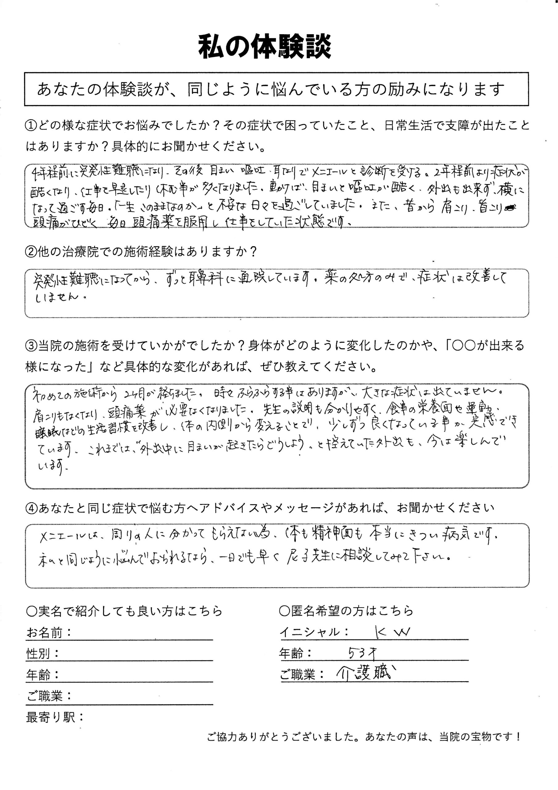 | 突発性難聴・メニエール病・めまい・嘔吐・耳鳴り K.W様 50代 女性 |