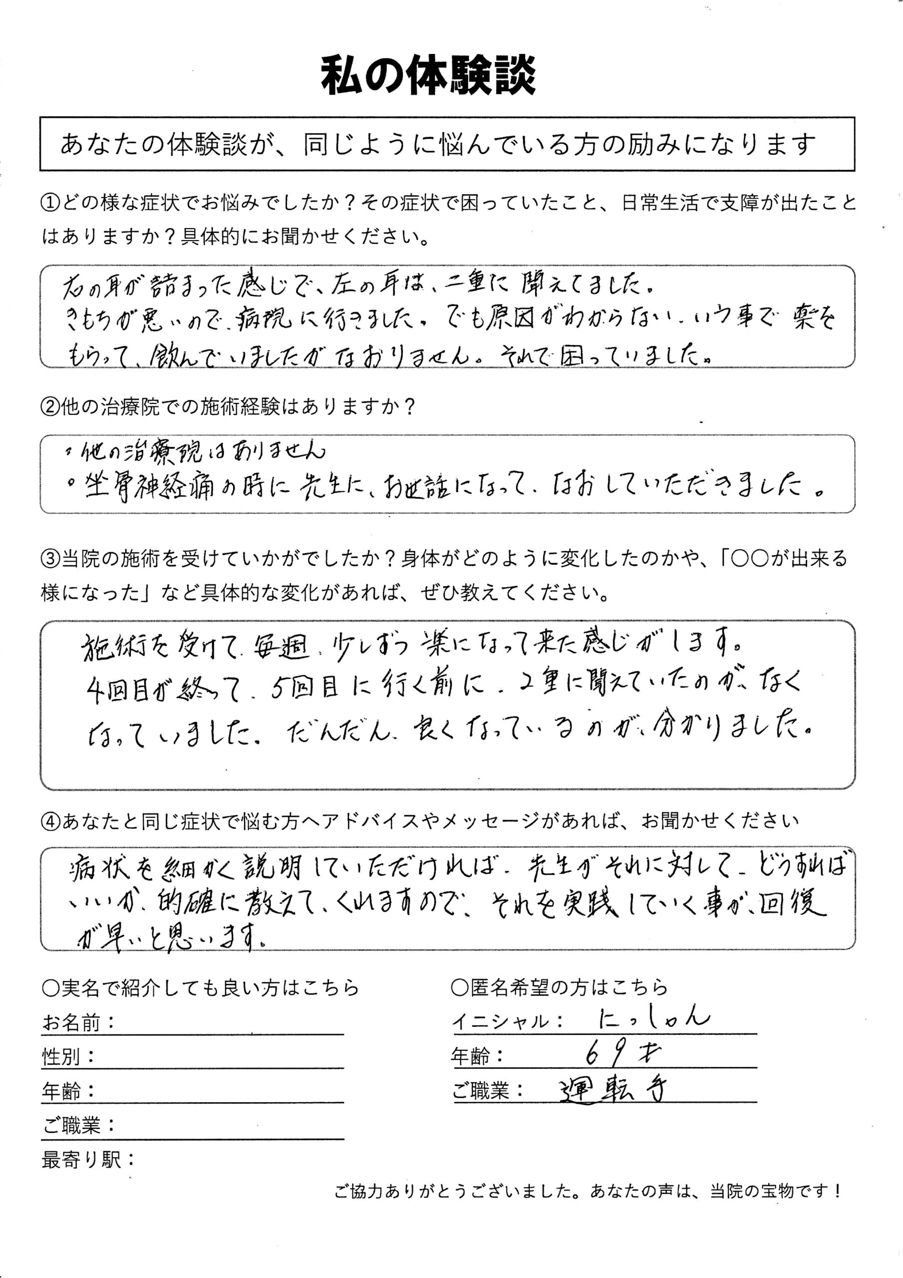 | 耳鳴り・喉の違和感・ヒステリー球・不眠・睡眠障害・首肩こり E.M様 60代 男性 |