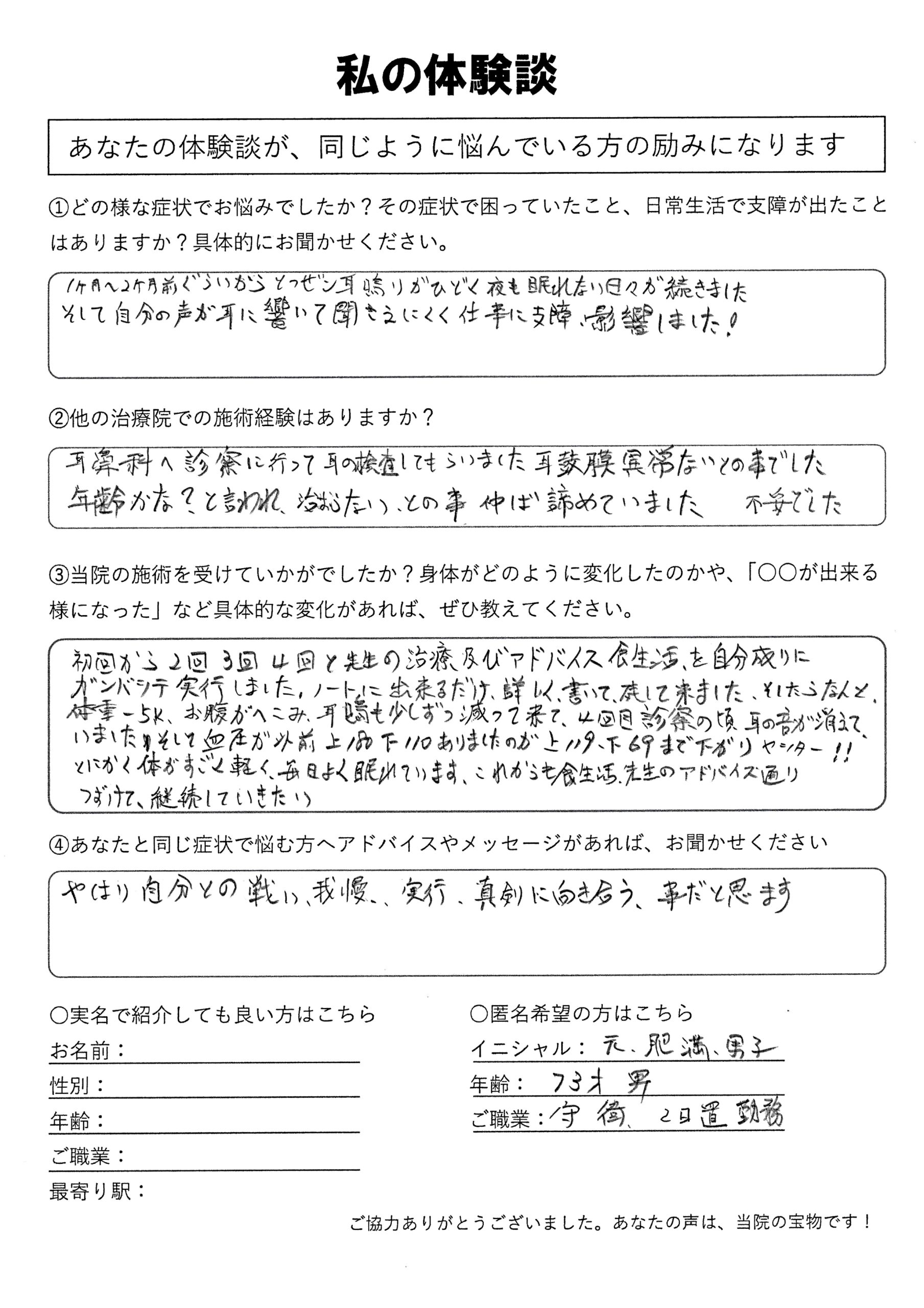 | 耳鳴り・不眠・高血圧・肥満 元肥満男子様 70代 男性 |