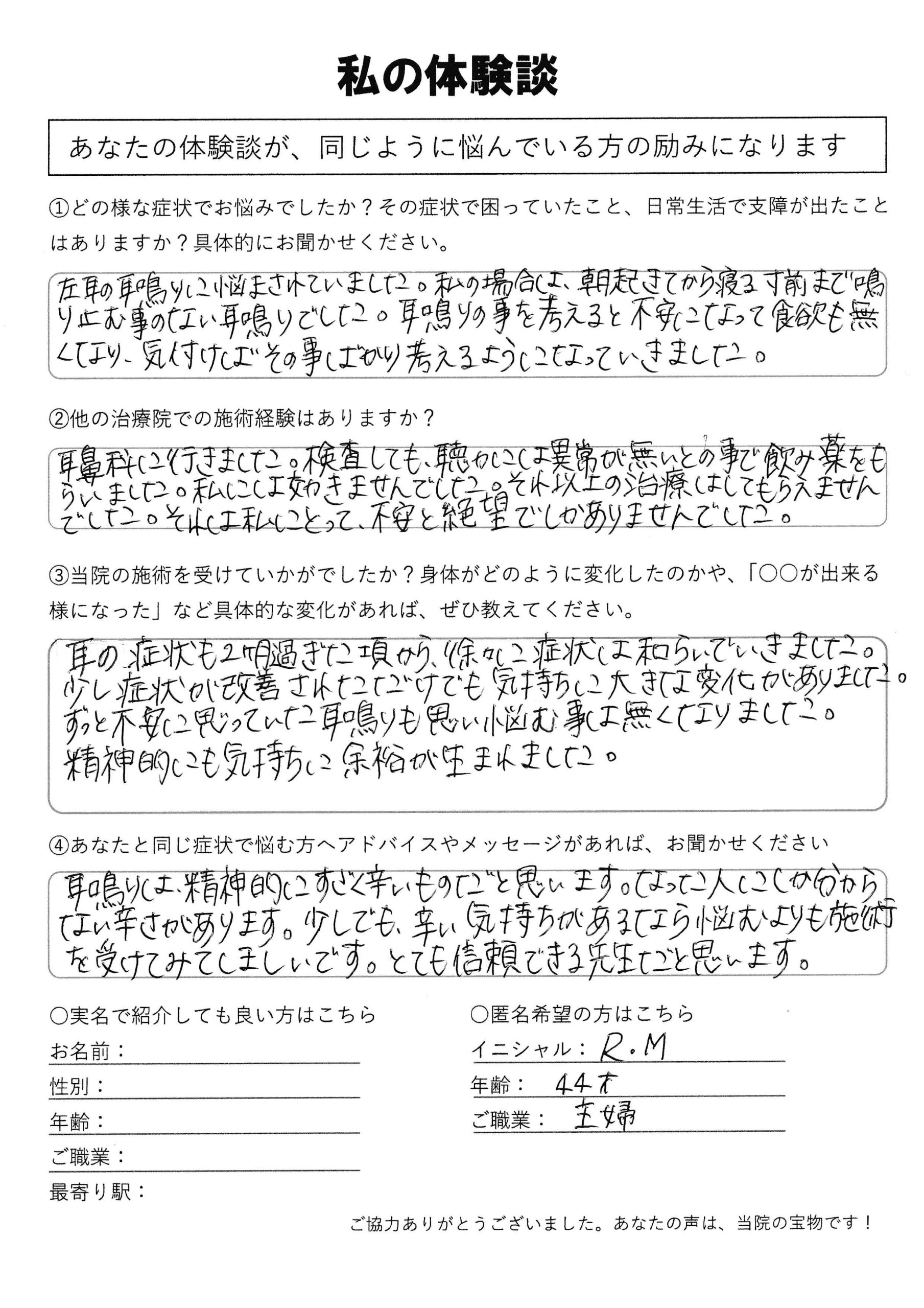 | 耳鼻科で検査をしても異常がみつからなかった耳鳴り R.M様 40代 女性 |