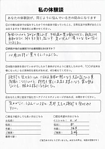 | めまい・吐き気・動悸・倦怠感・自律神経失調症・うつ病・体重増加・脂肪肝 M.H様 40代 女性 |