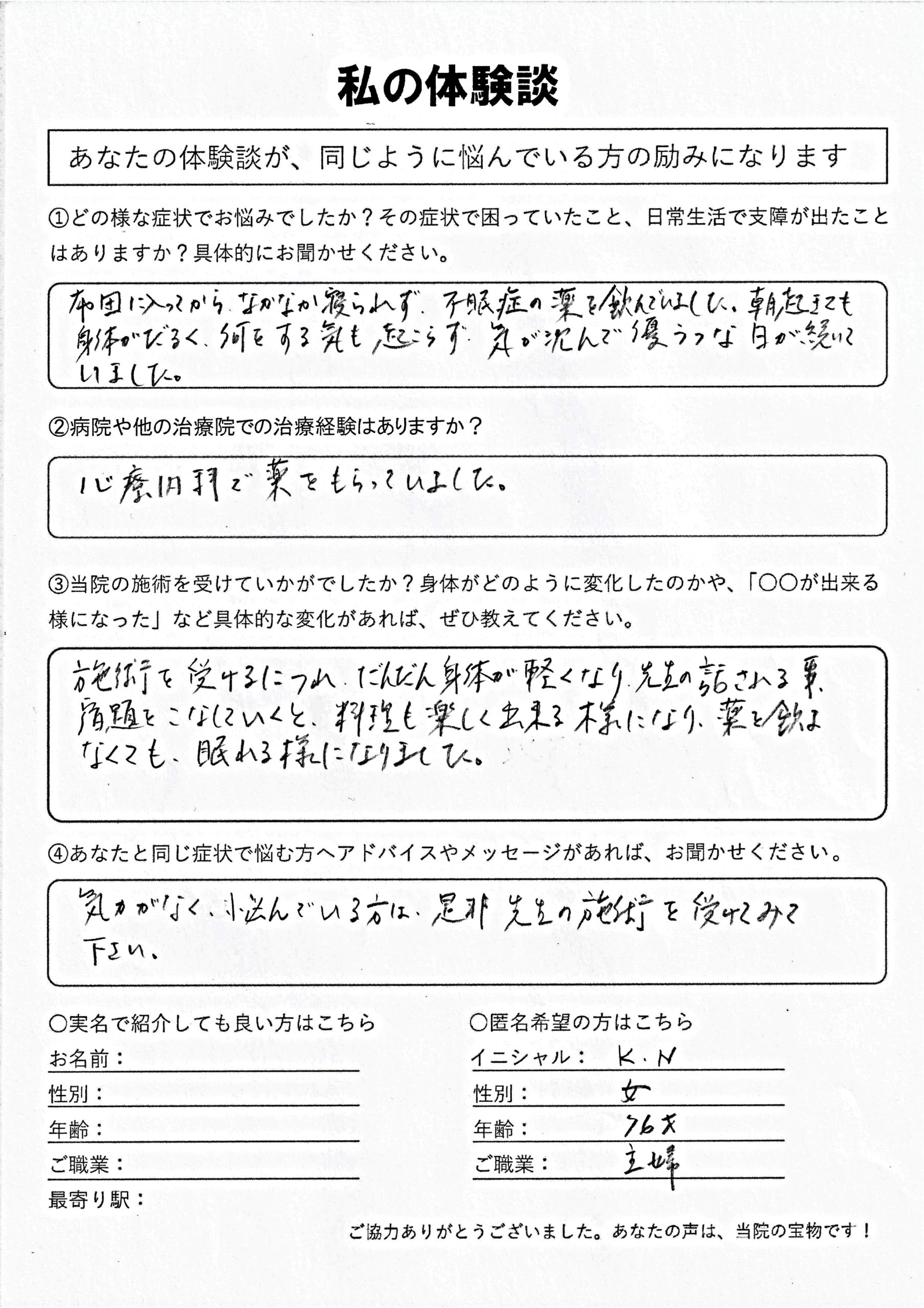 | 不眠・倦怠感・自律神経失調周夫・うつ病 K.N様 70代 女性 |