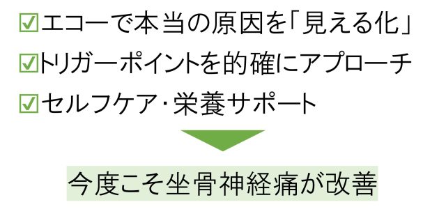 あなたの坐骨神経痛は、今のままでは原因となるトリガーポイントに適切にアプローチできていないため、症状が一向に改善しない可能性があります。