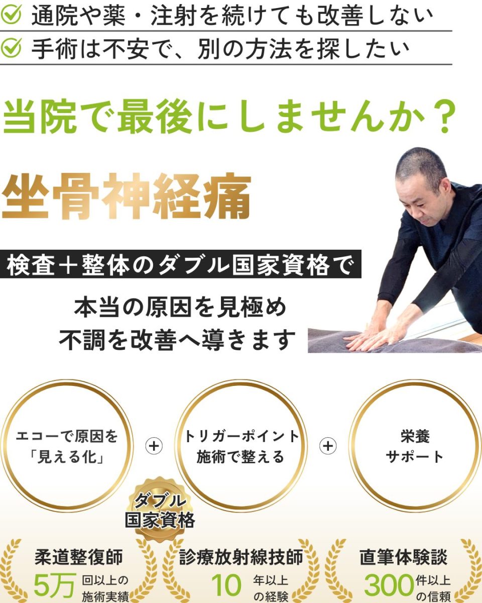 もしあなたがこのような坐骨神経痛でお悩みであれば、当院にお任せください。