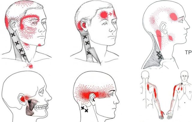 特定の筋肉に生じたトリガーポイント(×印)が、離れた場所に症状が出るパターン(赤い部分)を表しています。